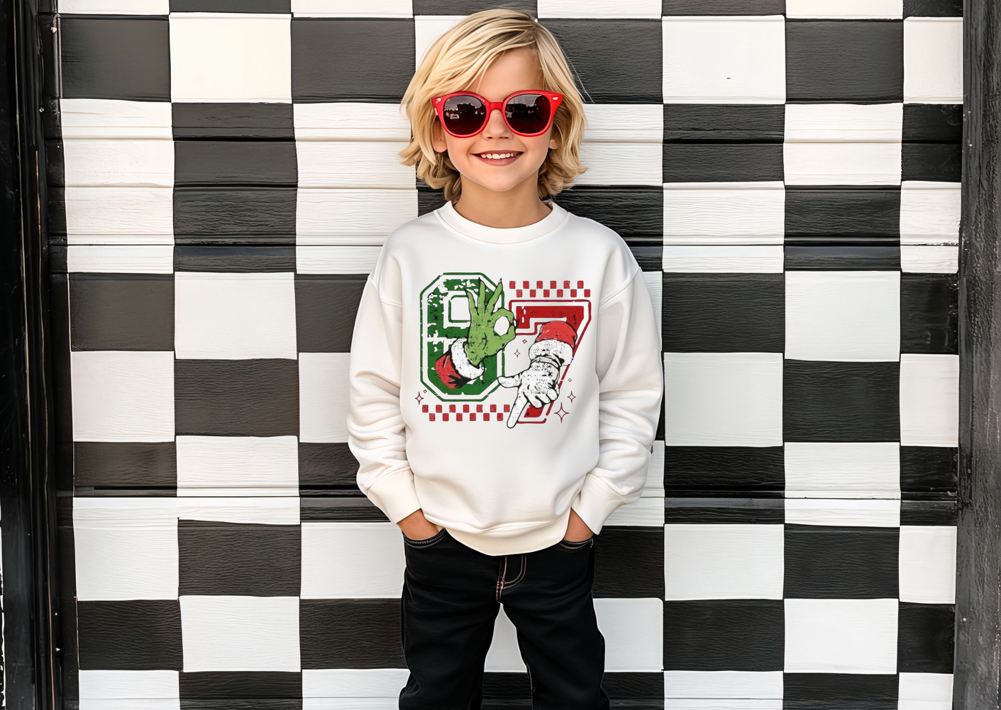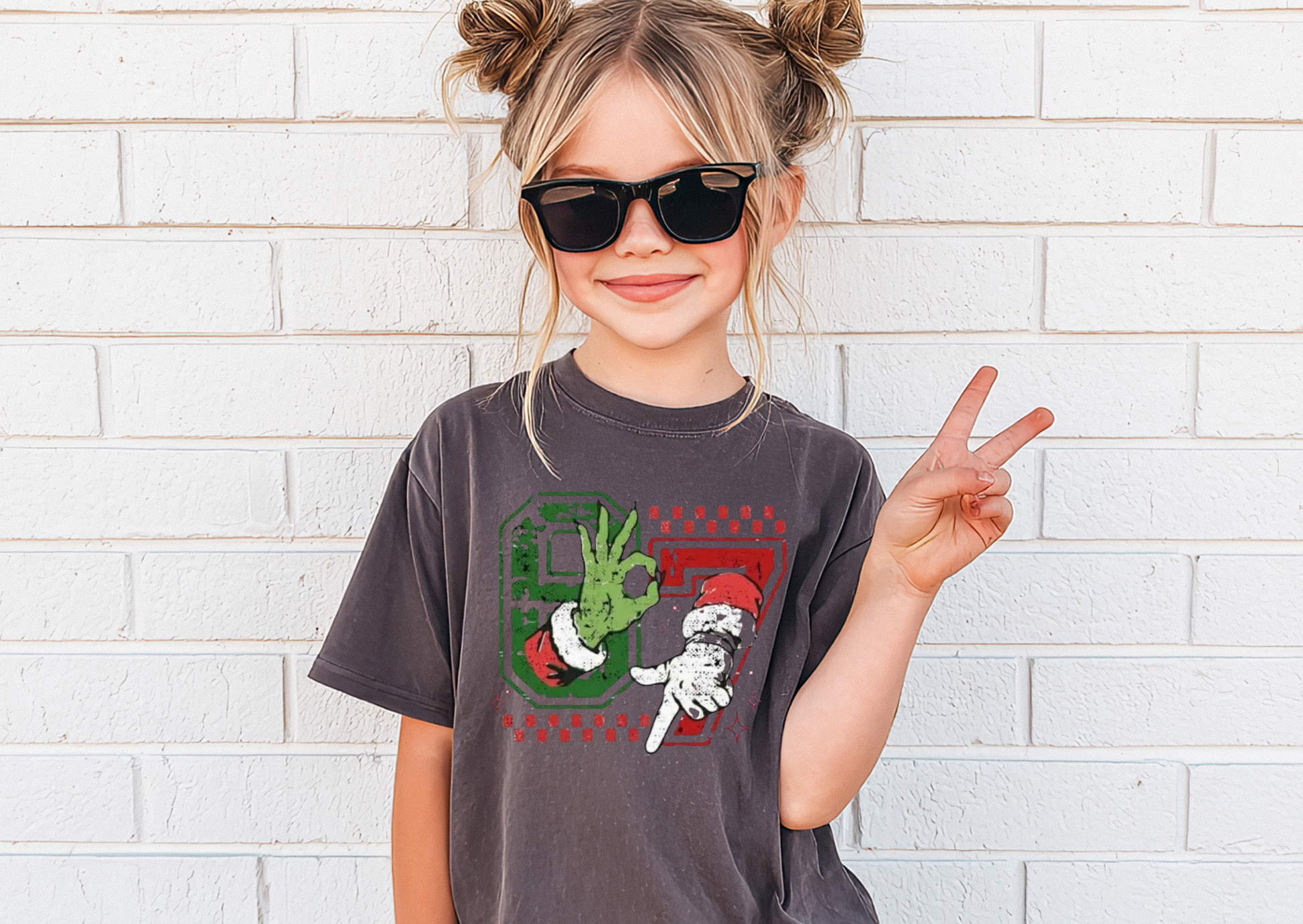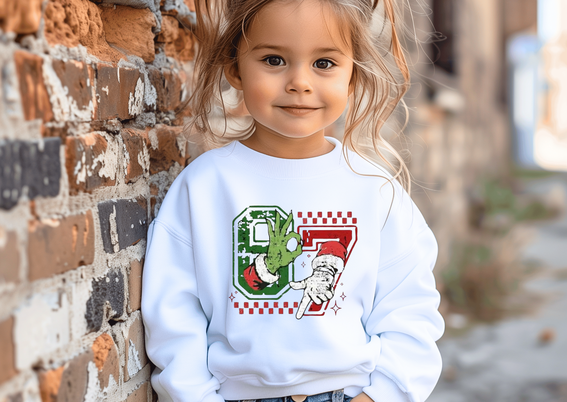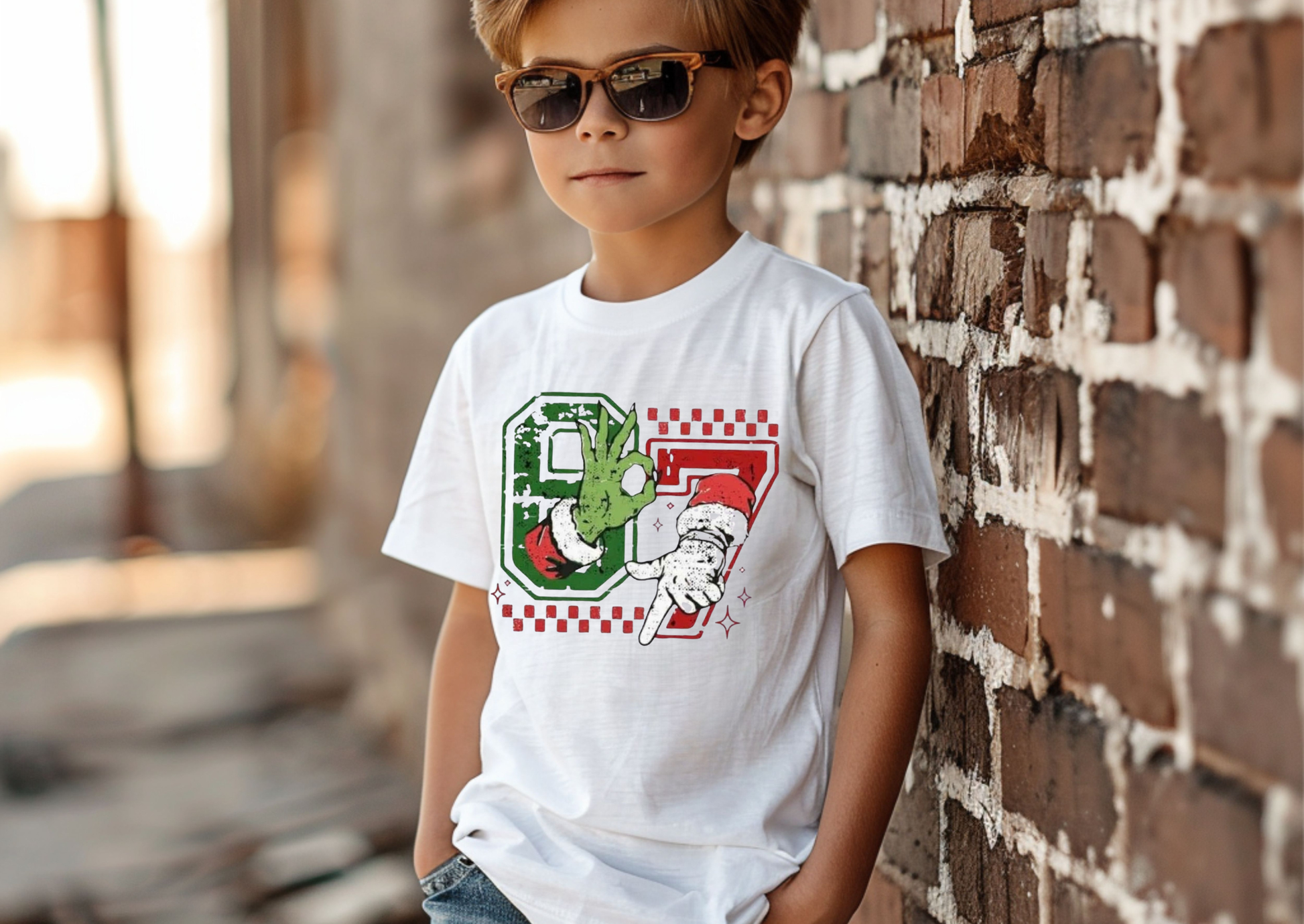 This festive kids’ top features bold, distressed “67” numbers with Grinch-inspired hands creating the perfect playful holiday design. It’s fun, bright, and ready for every Christmas activity — from school parties to family photos.