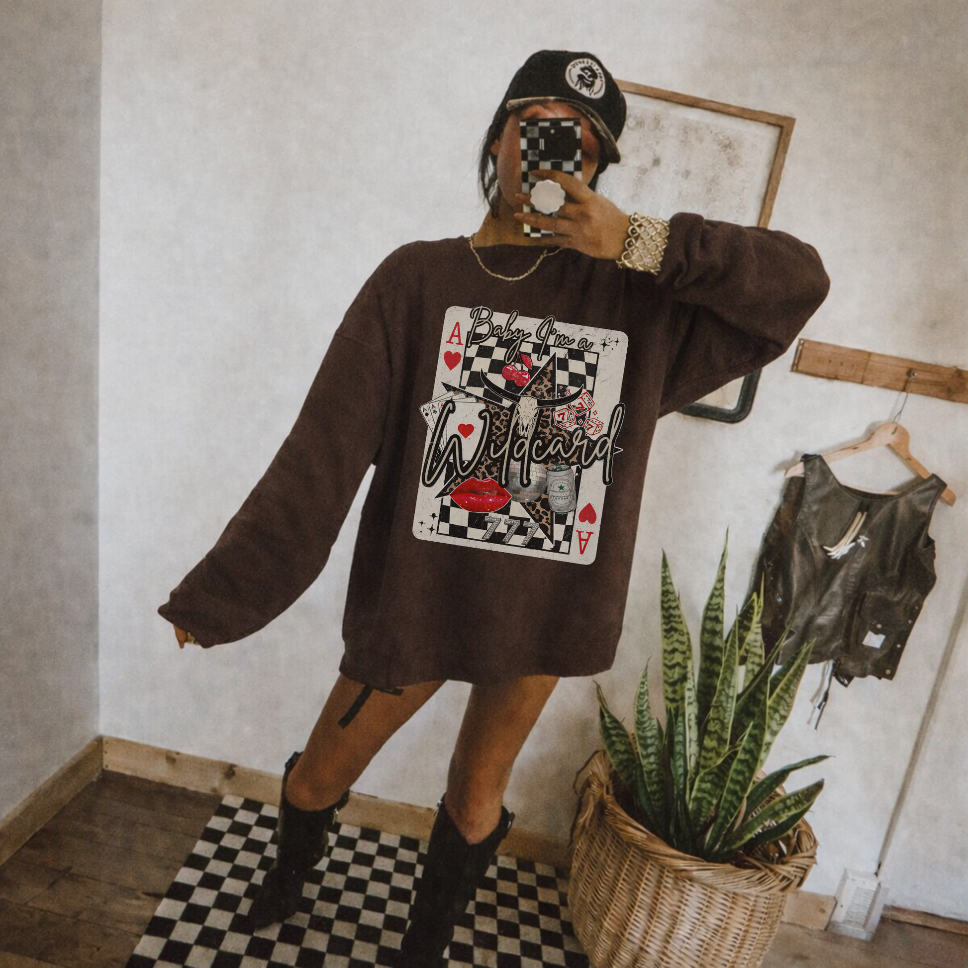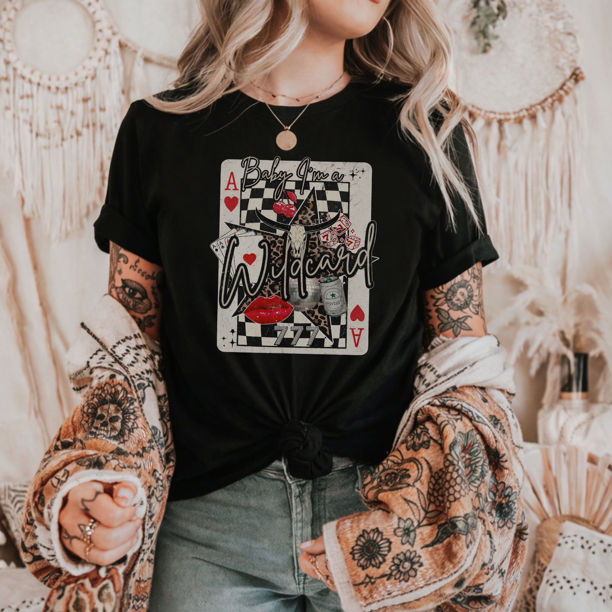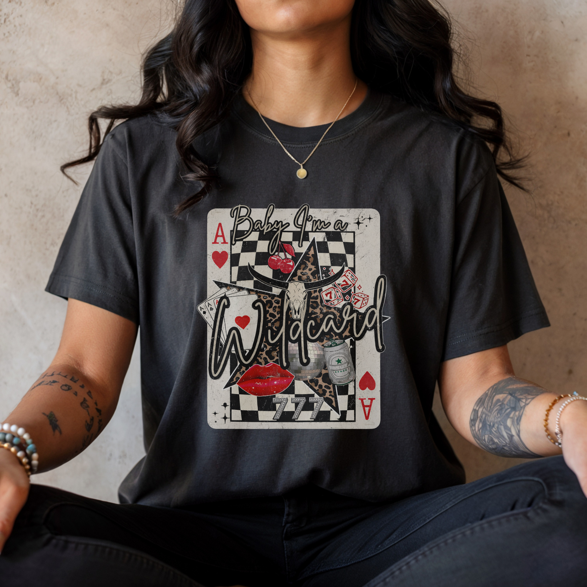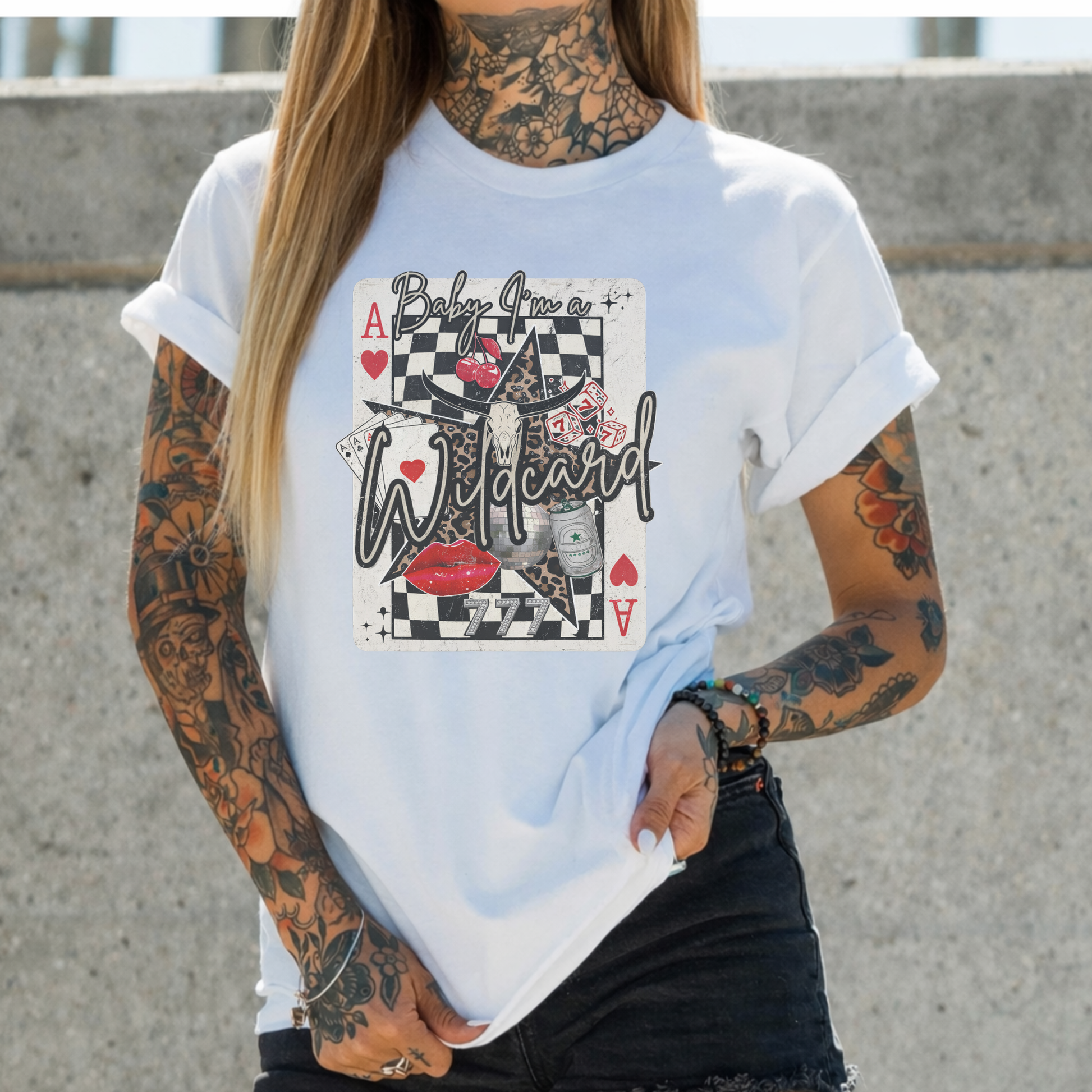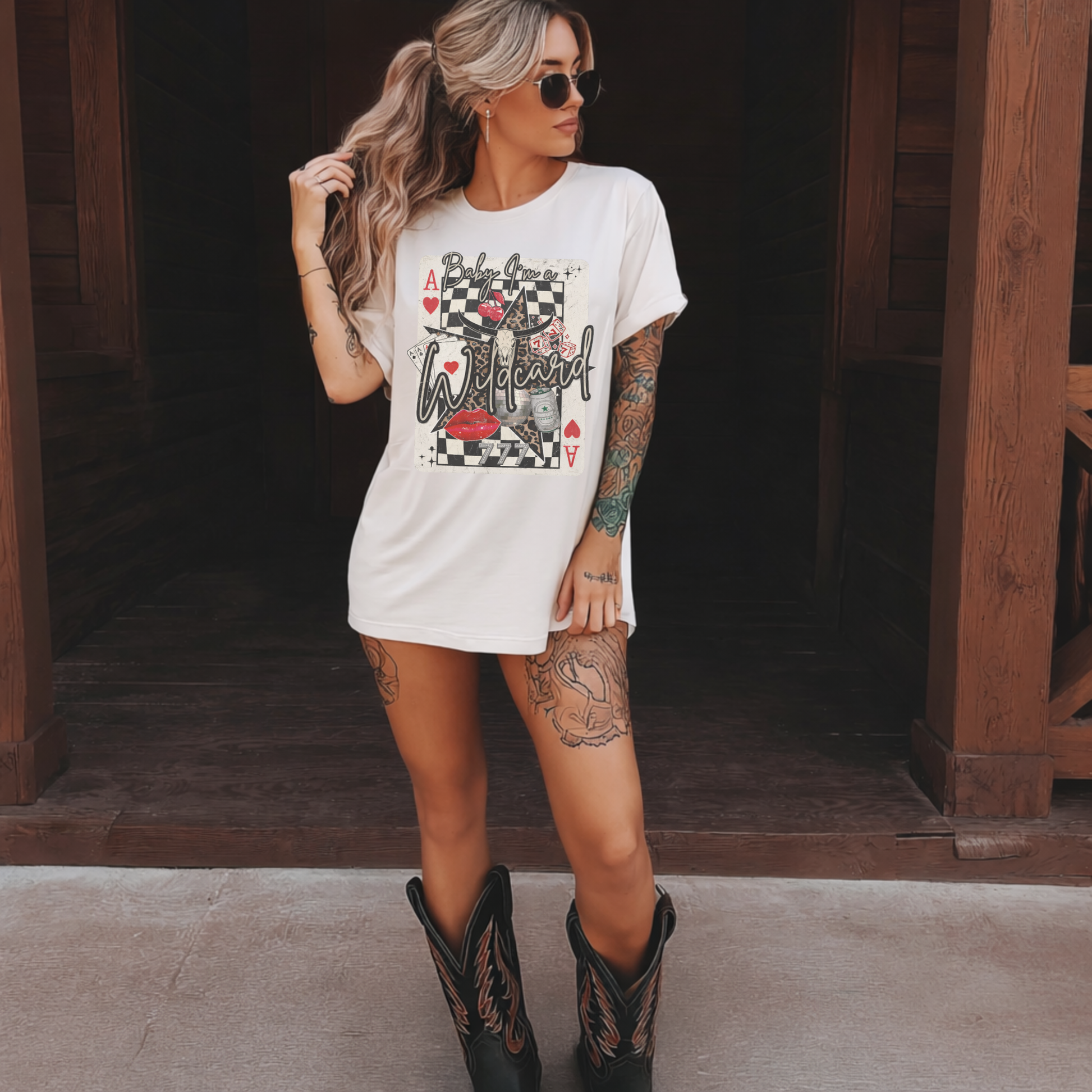 This bold graphic brings together western attitude and Vegas chaos with playing cards, cherries, dice, leopard print, and just enough sparkle to let everyone know you are not the safe option.