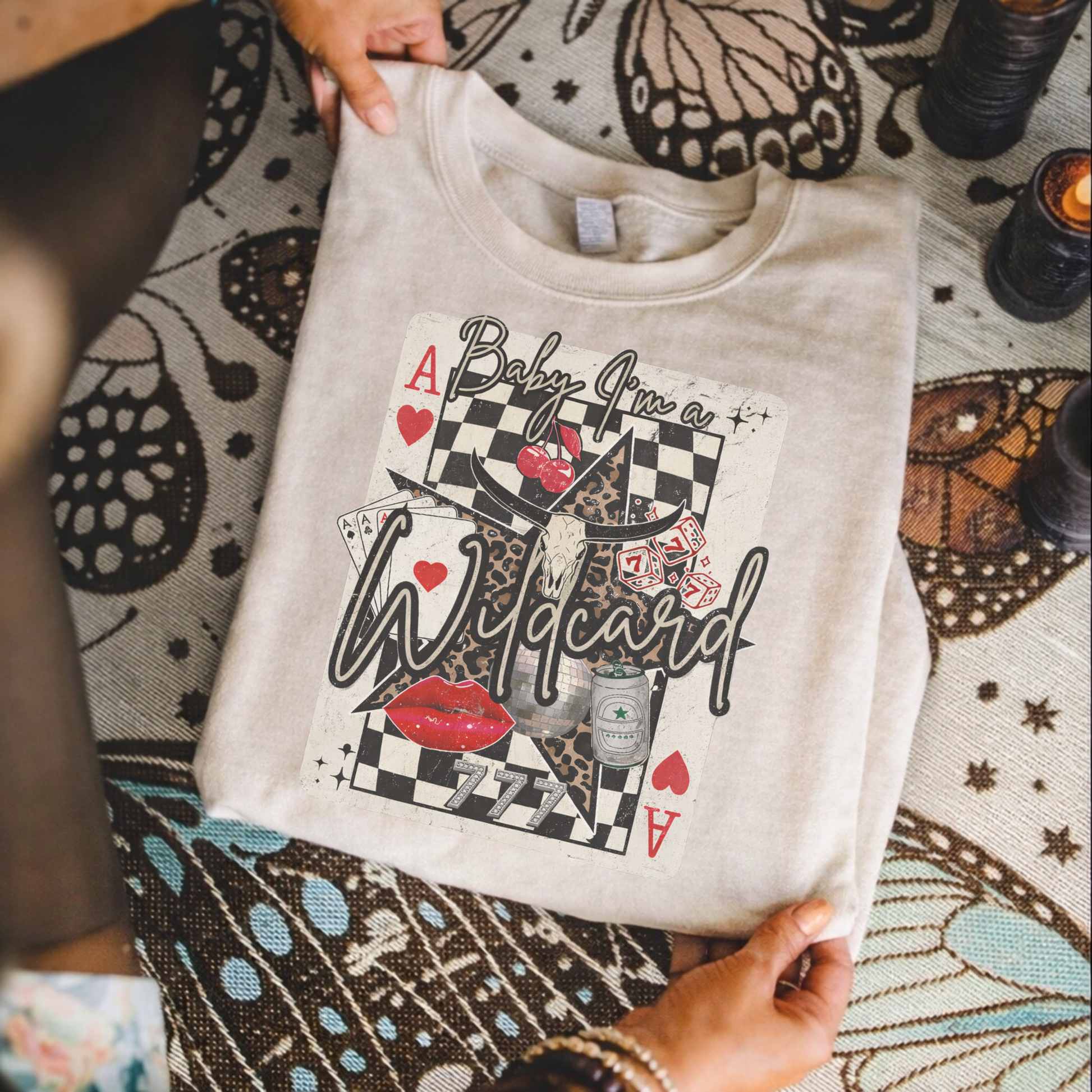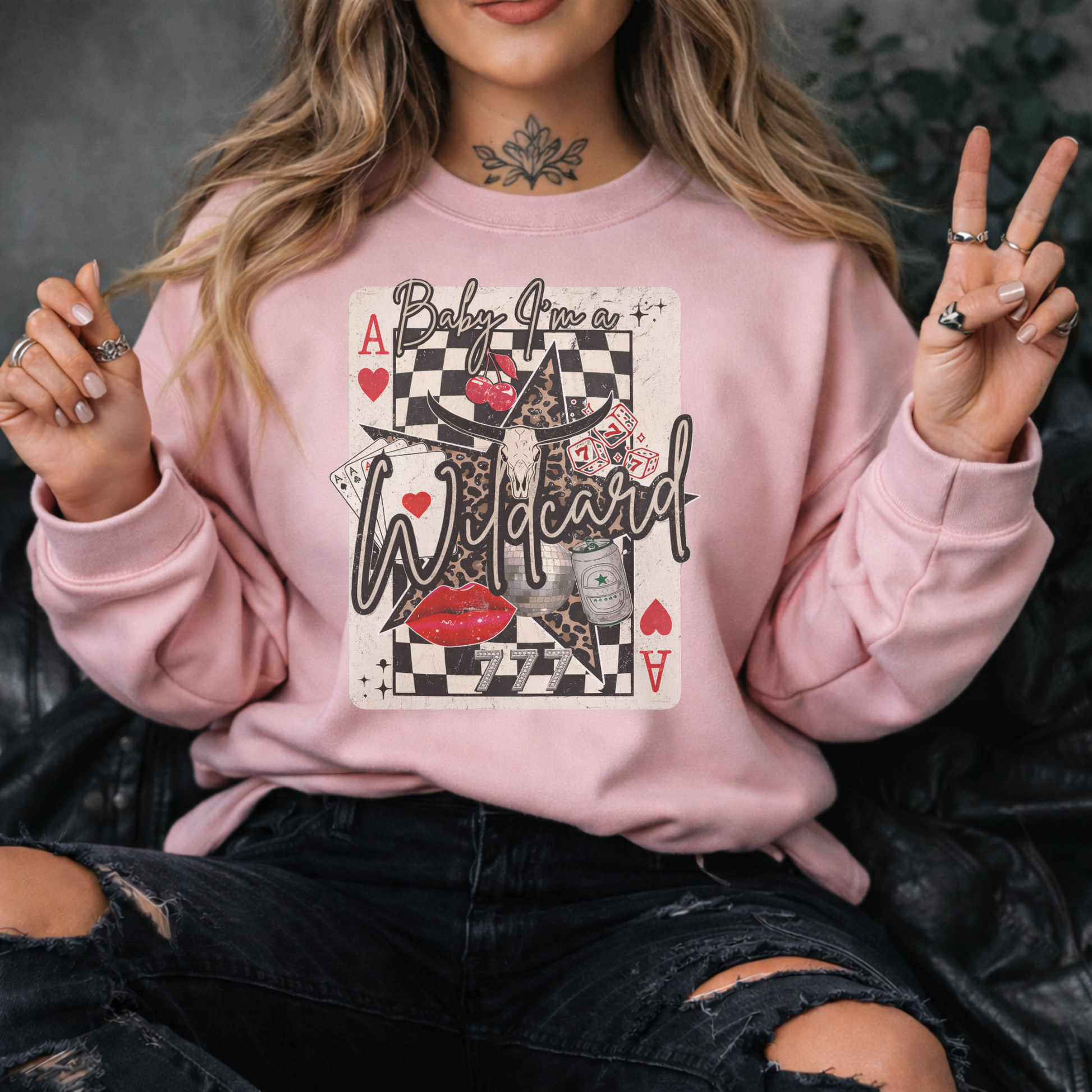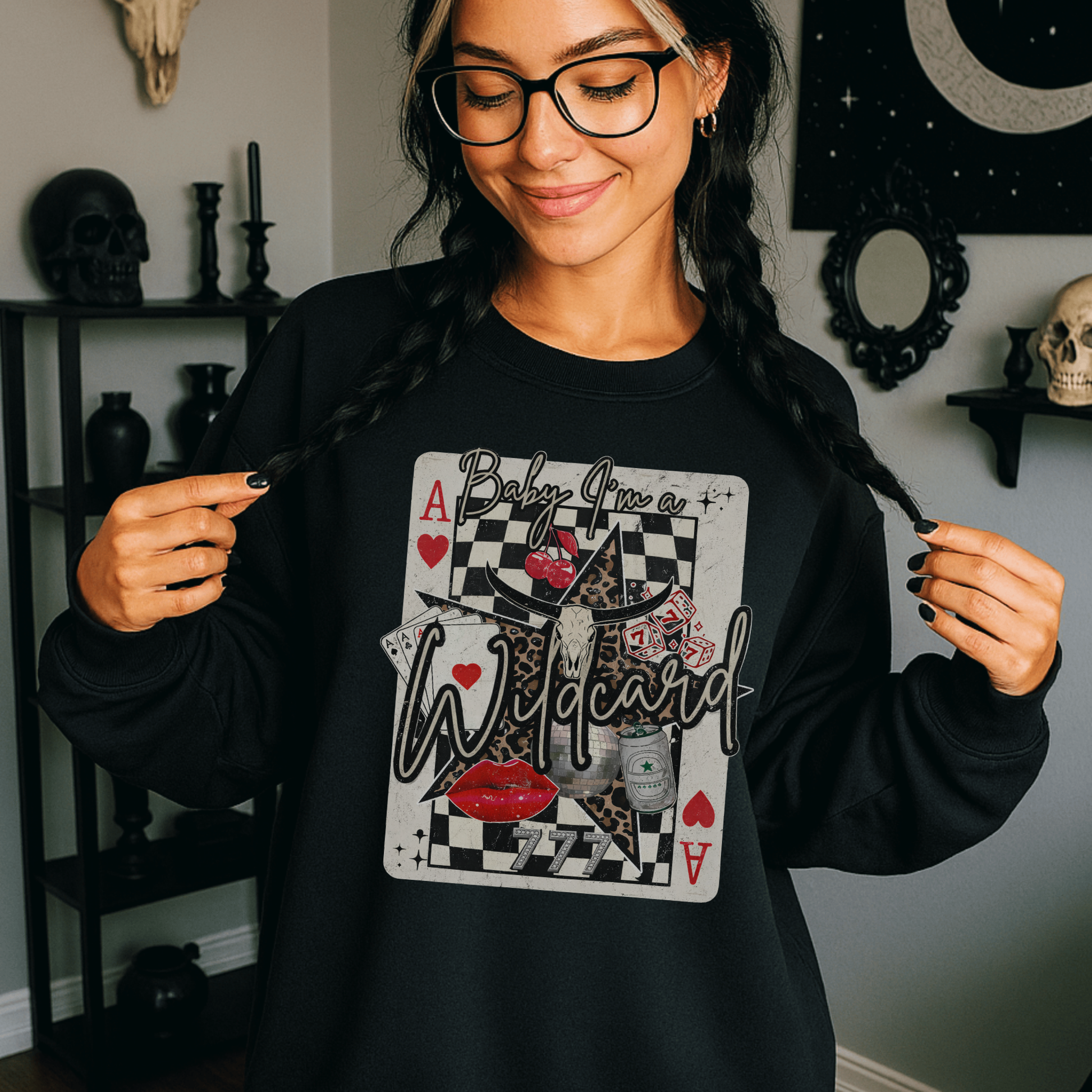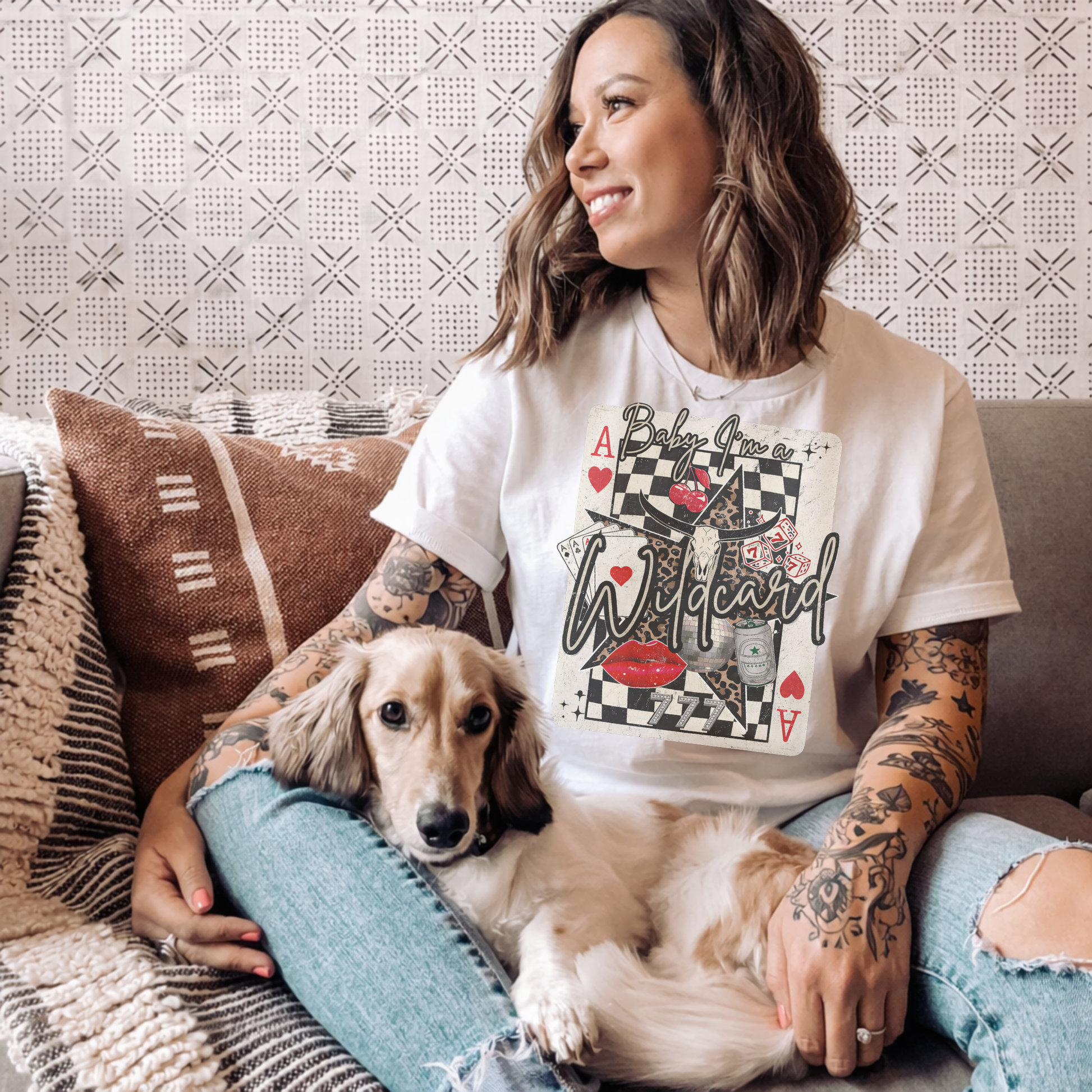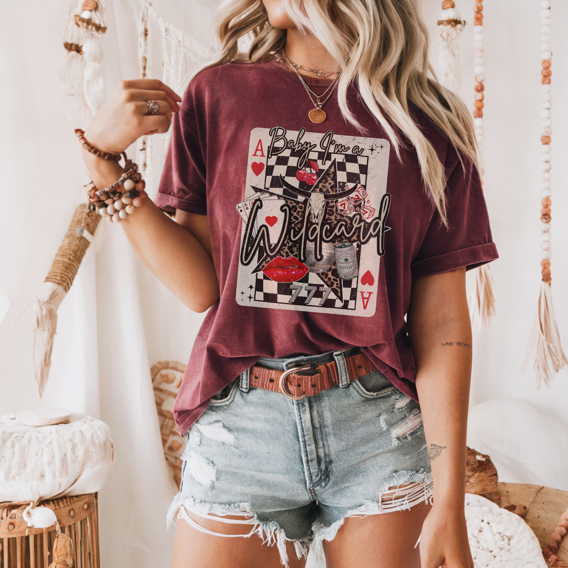 This bold graphic brings together western attitude and Vegas chaos with playing cards, cherries, dice, leopard print, and just enough sparkle to let everyone know you are not the safe option.