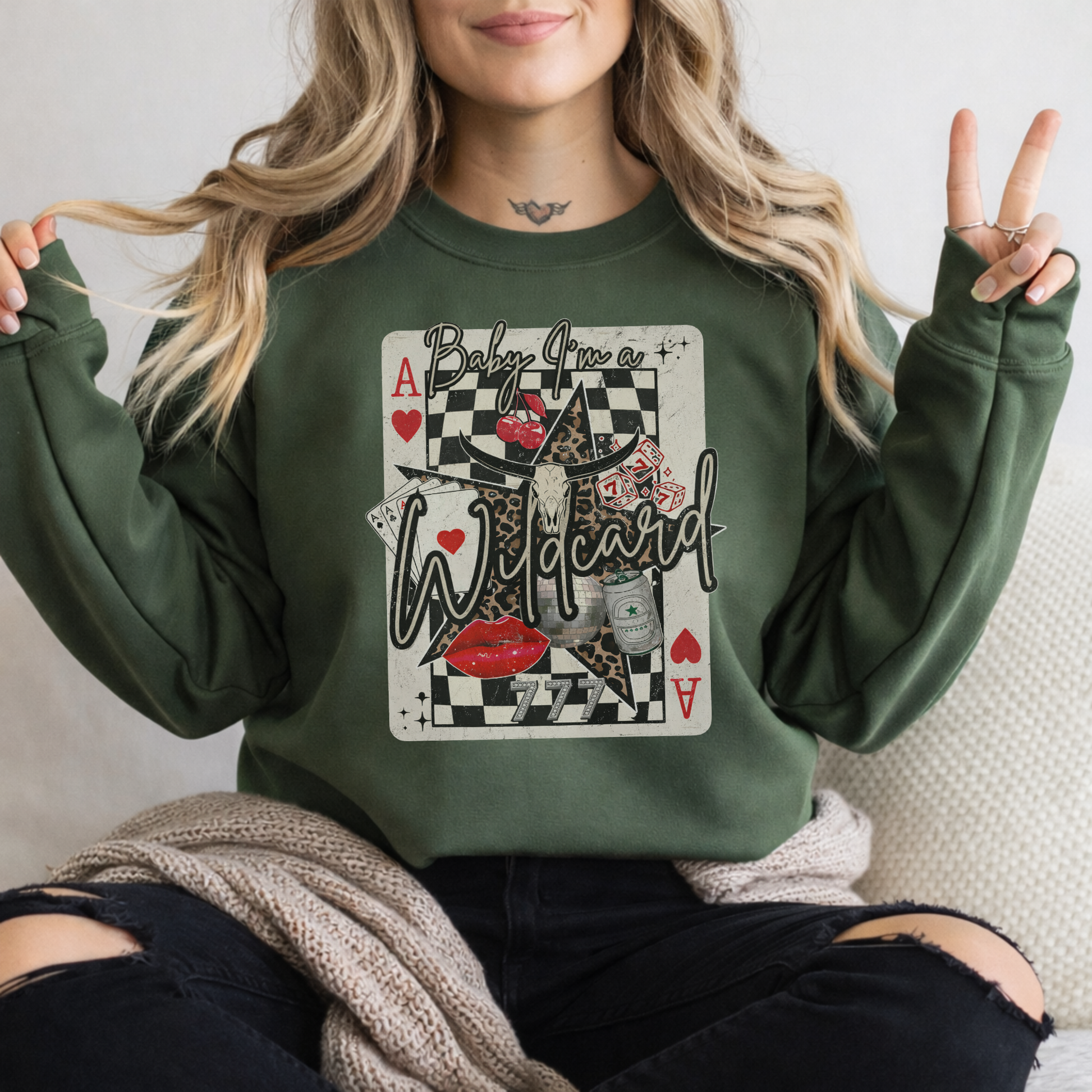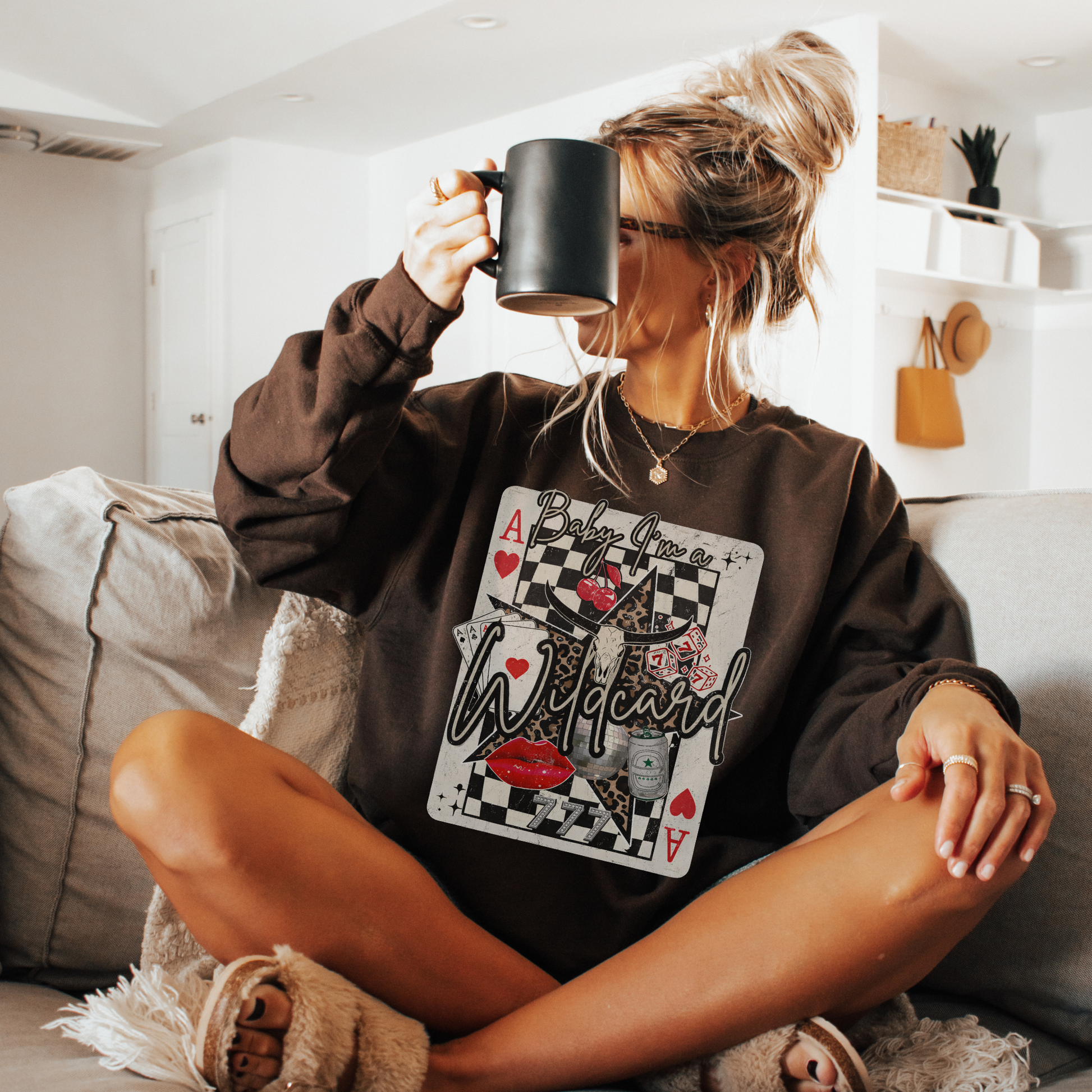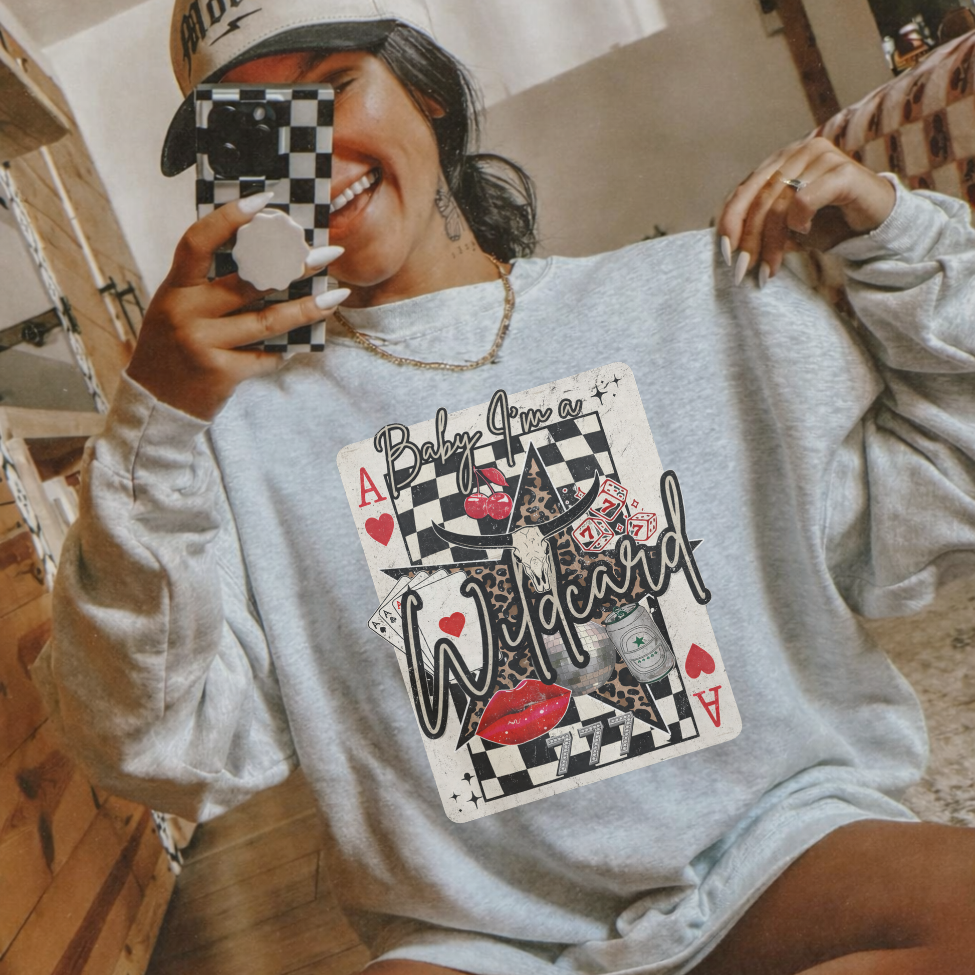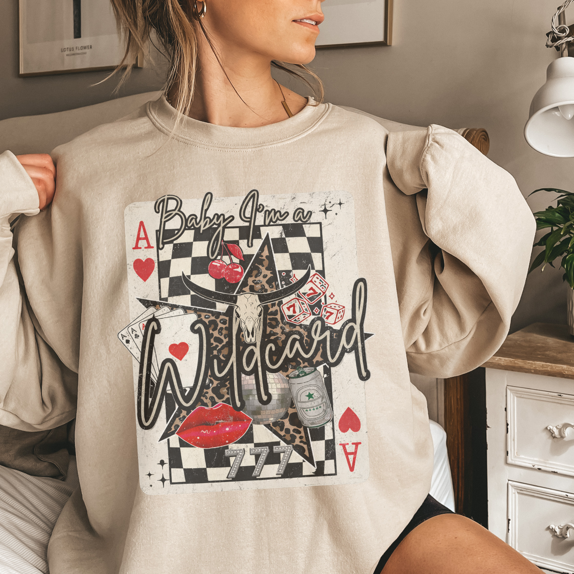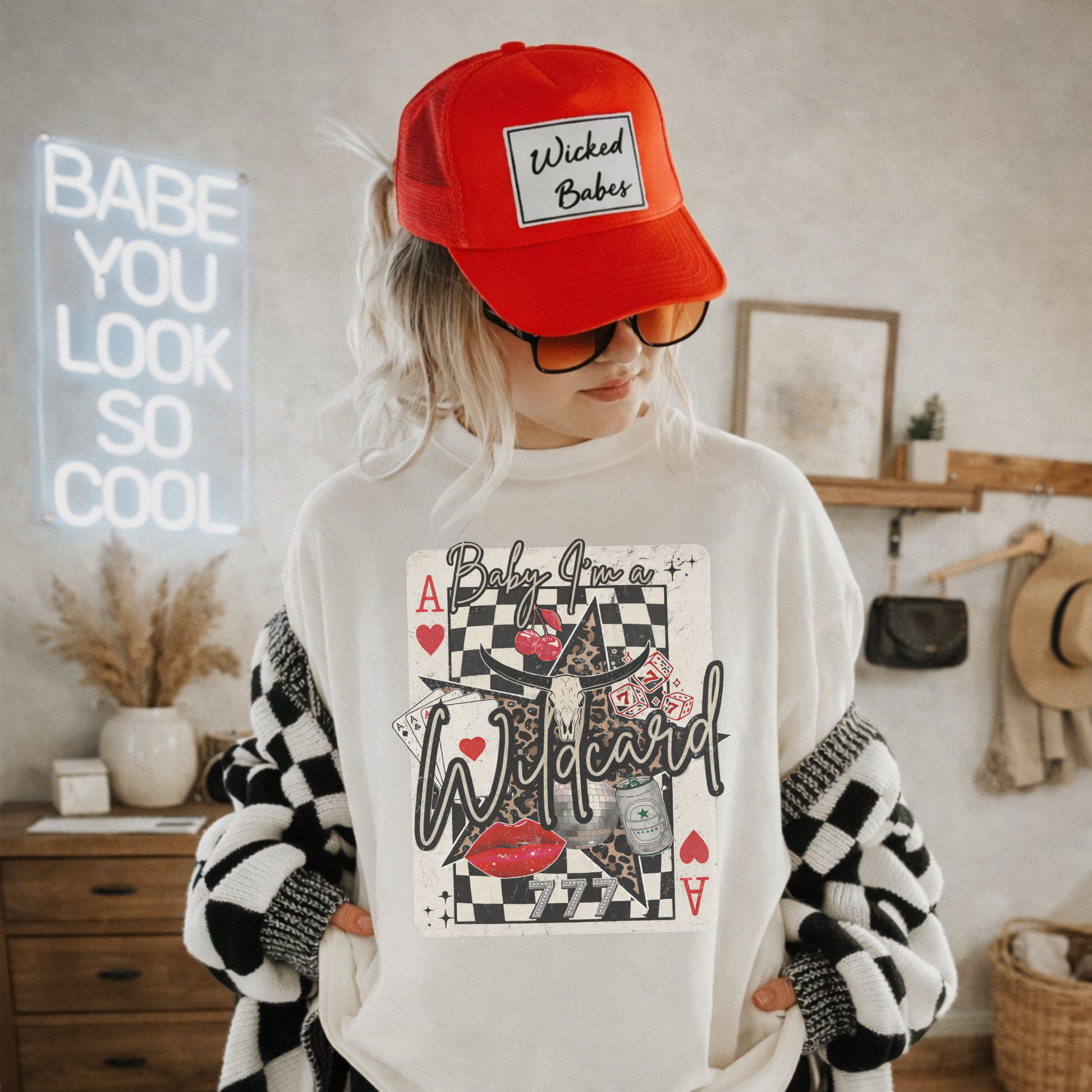 This bold graphic brings together western attitude and Vegas chaos with playing cards, cherries, dice, leopard print, and just enough sparkle to let everyone know you are not the safe option.