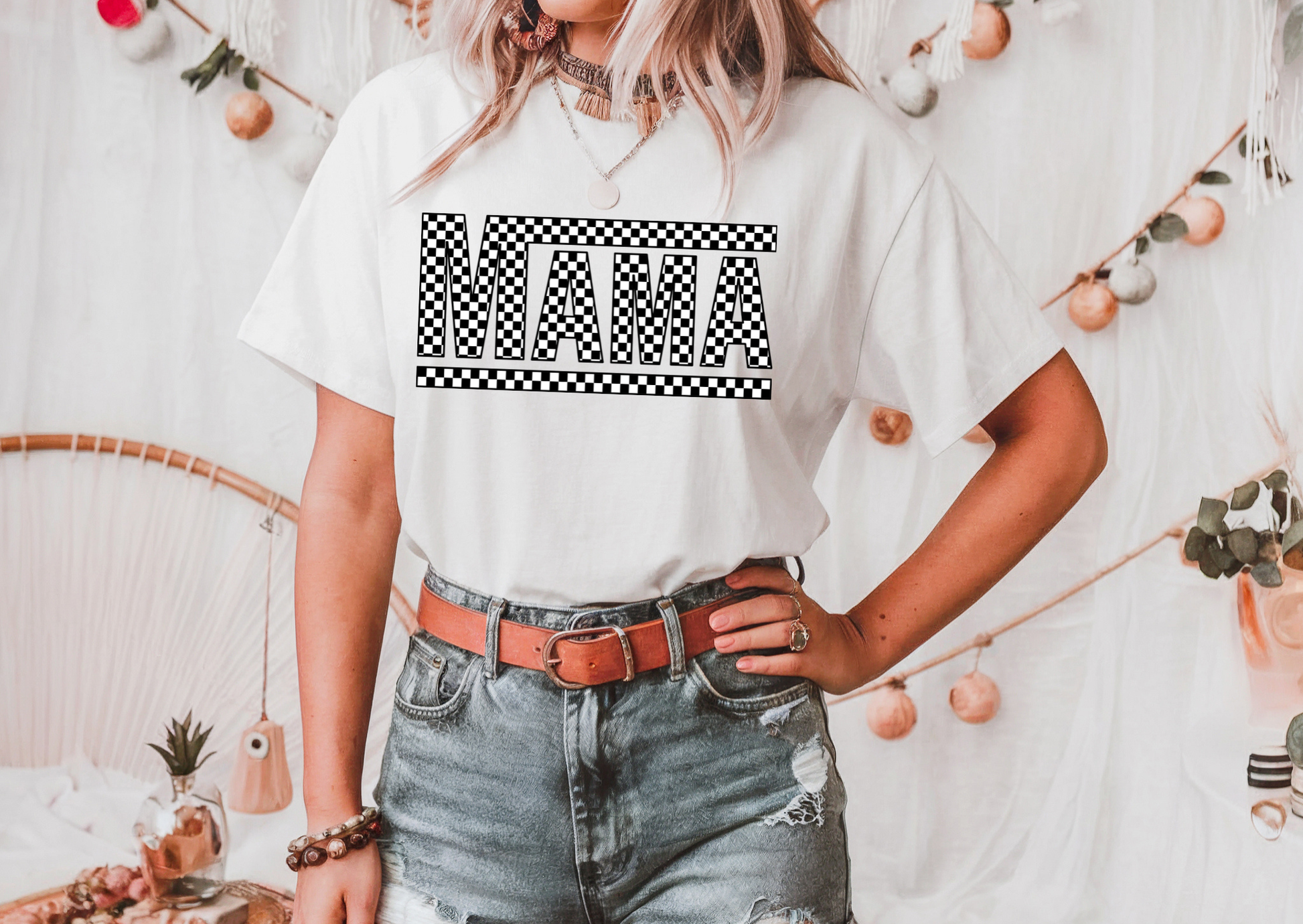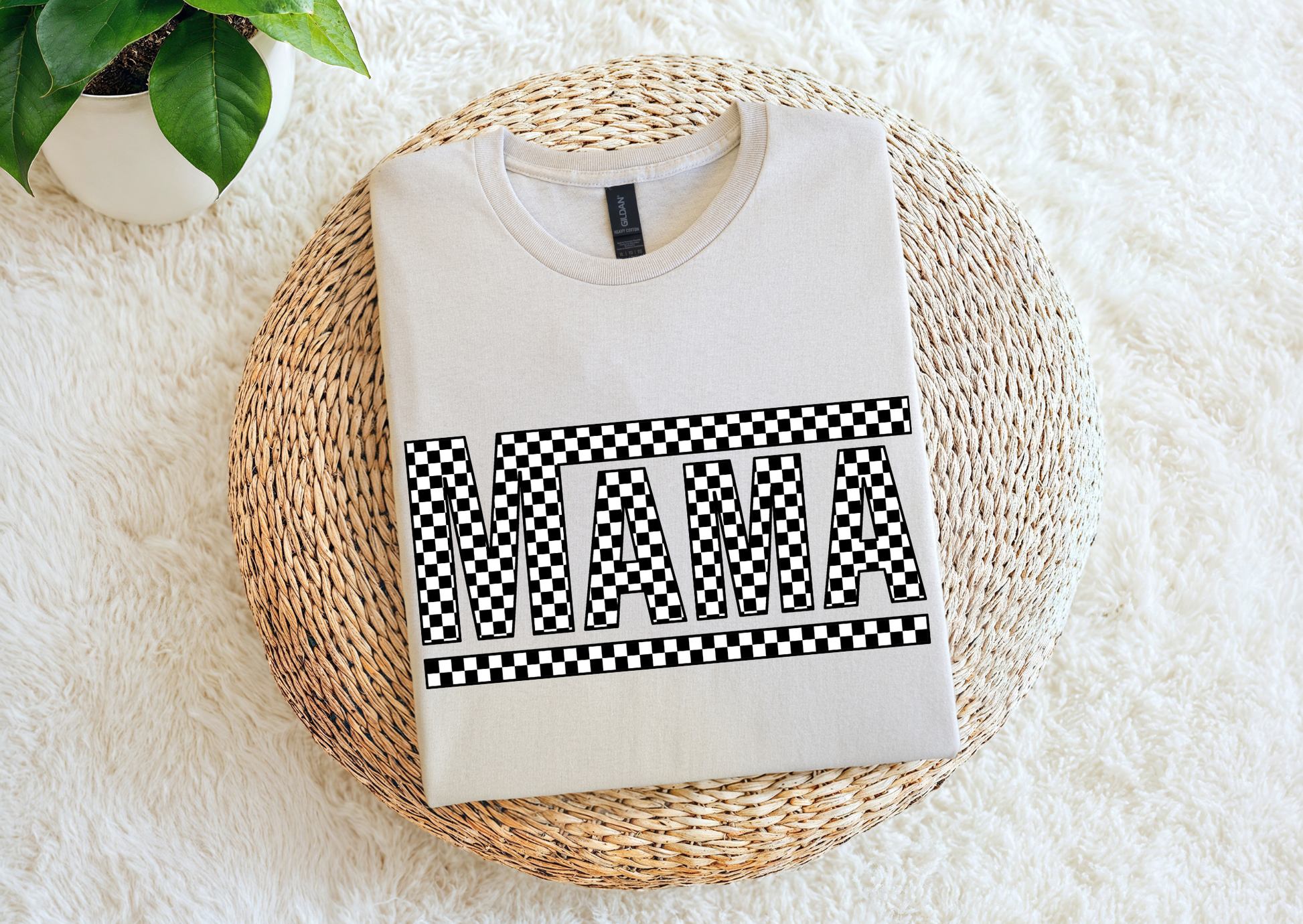 Turn heads with this bold Checkered MAMA tee or sweater 🖤🏁