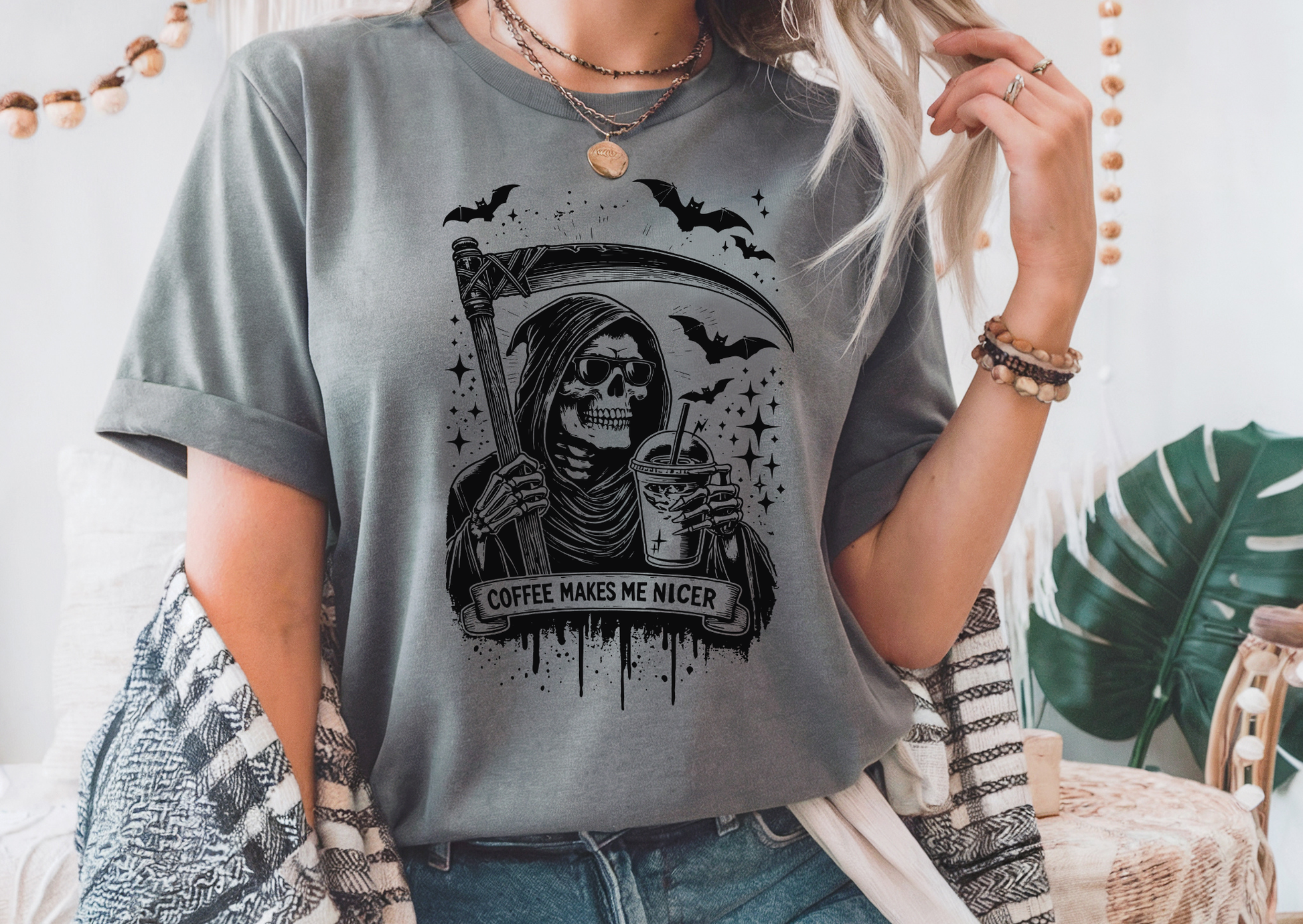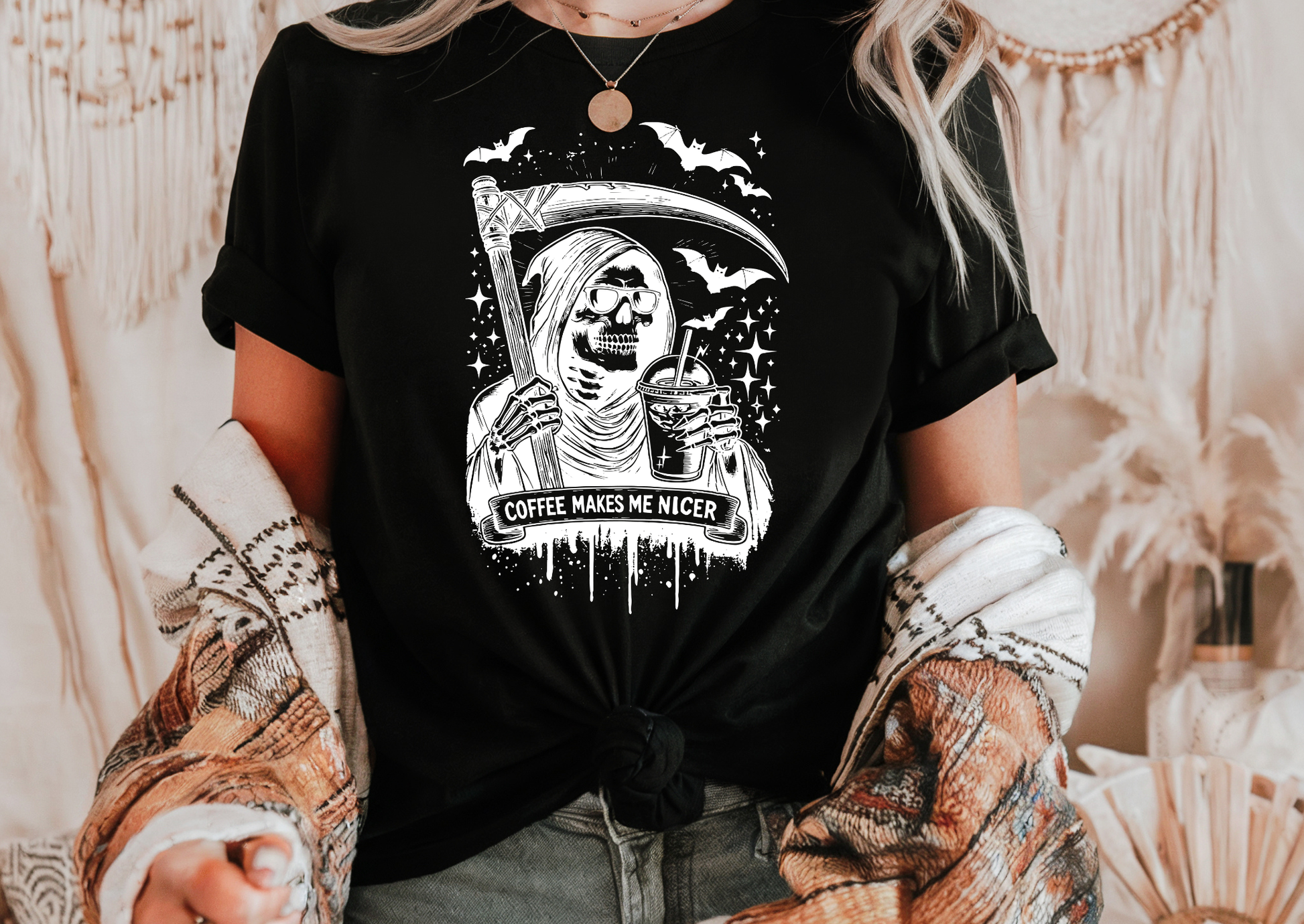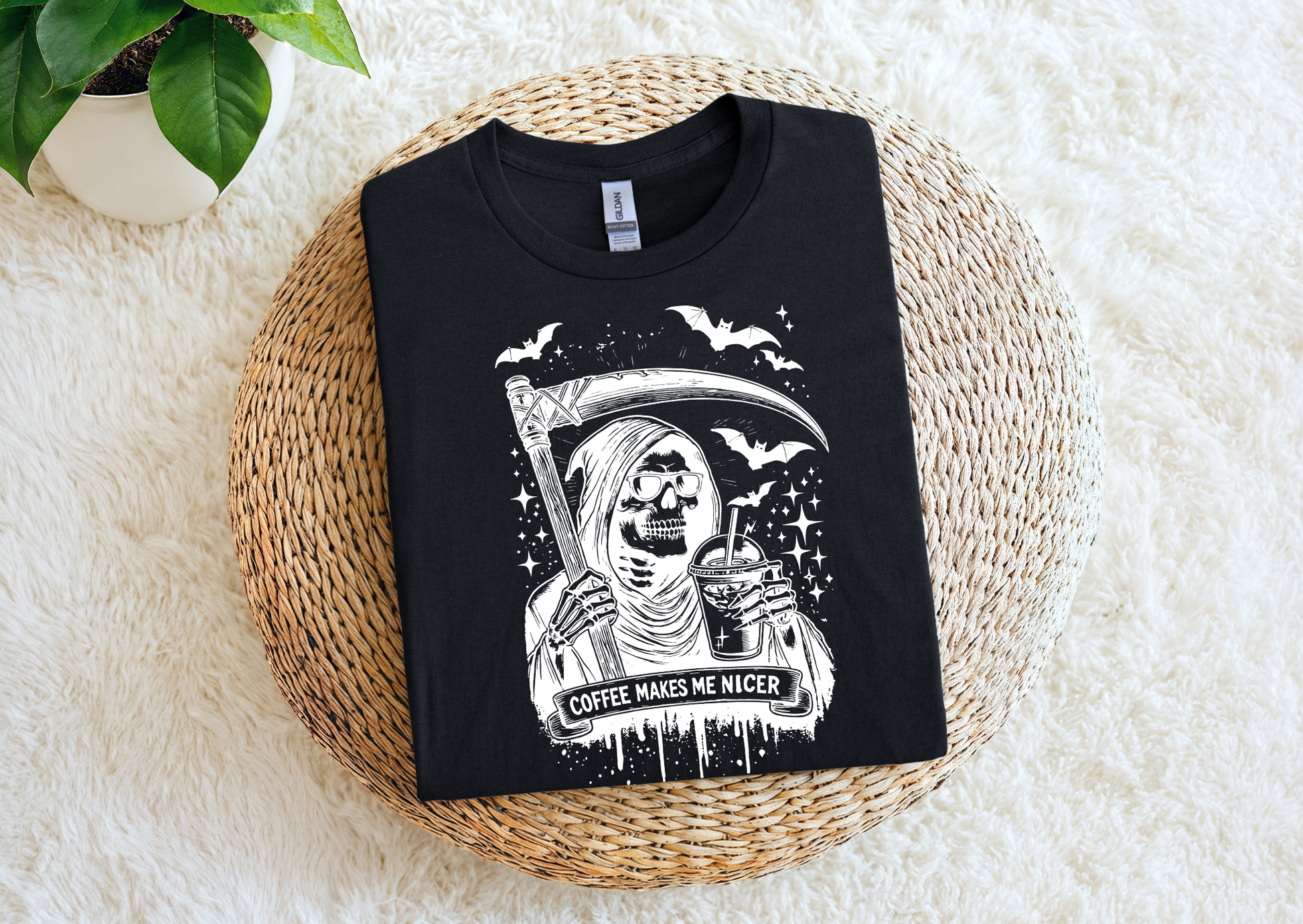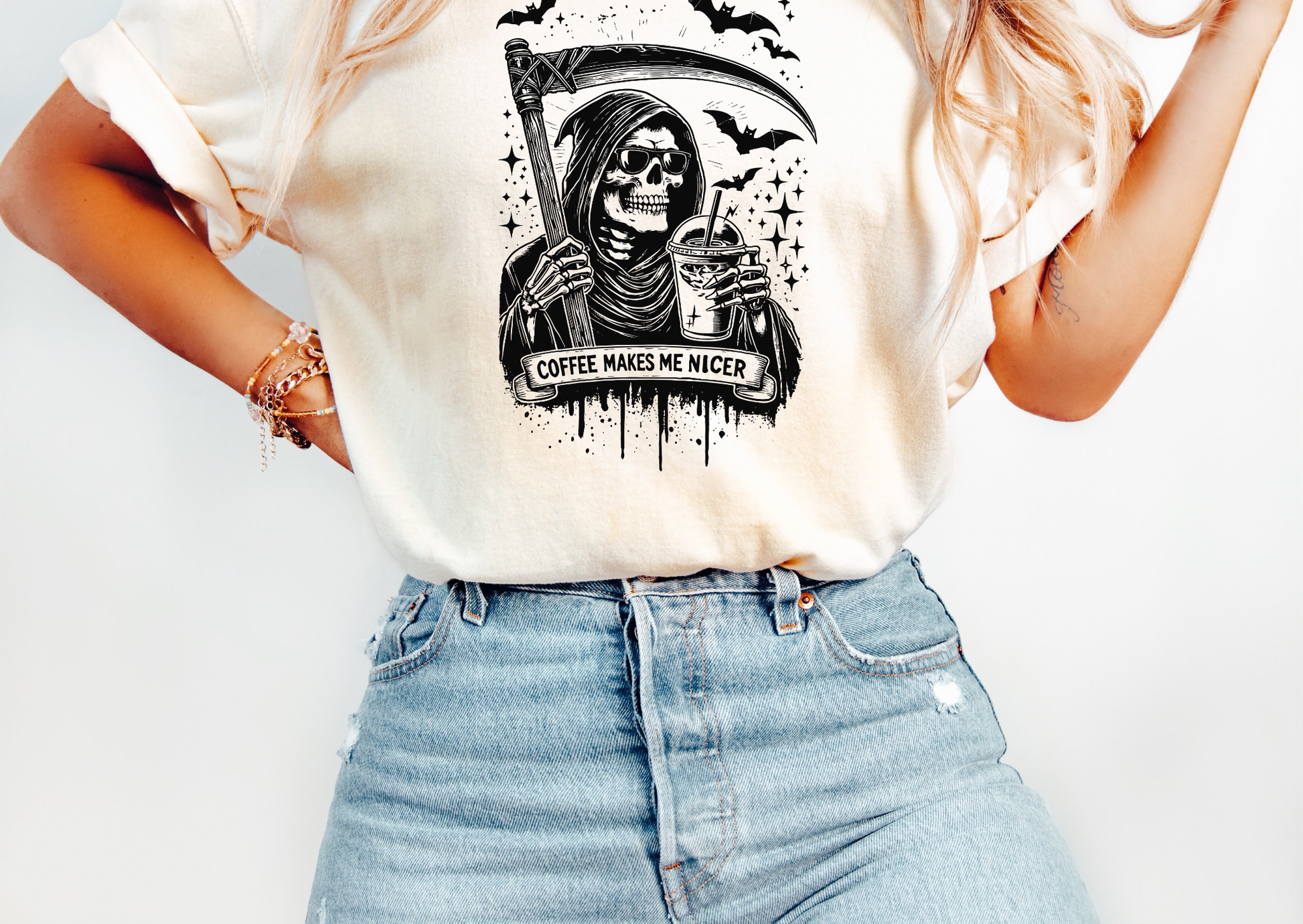 Because caffeine is the only thing standing between you and chaos. This bold design features a reaper with iced coffee in hand... for those who thrive on caffeine, sarcasm, and dark humor.