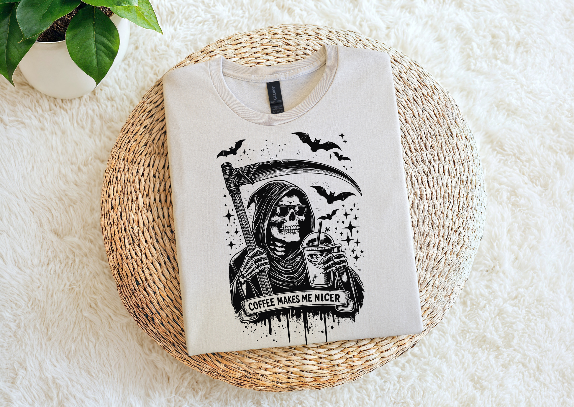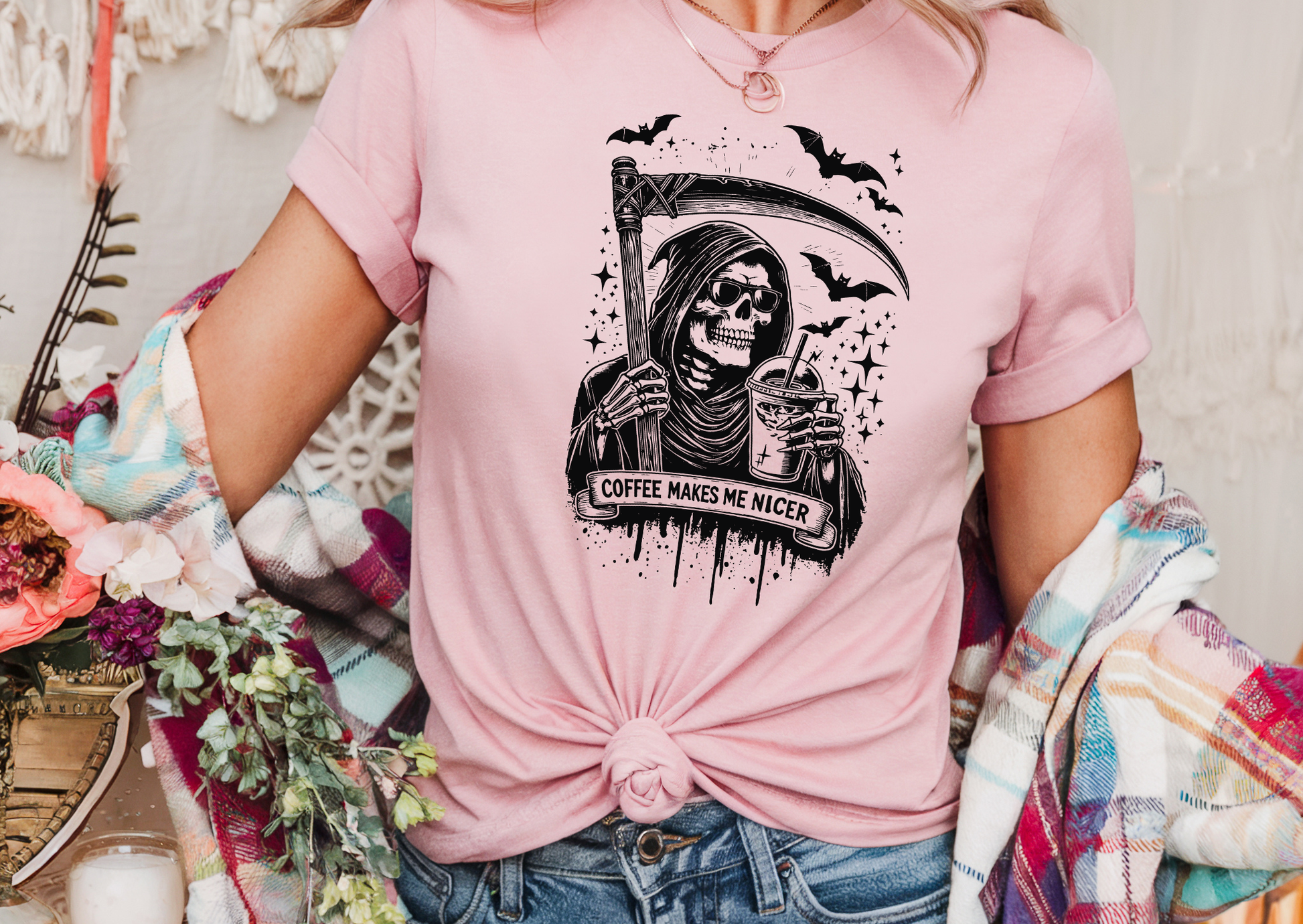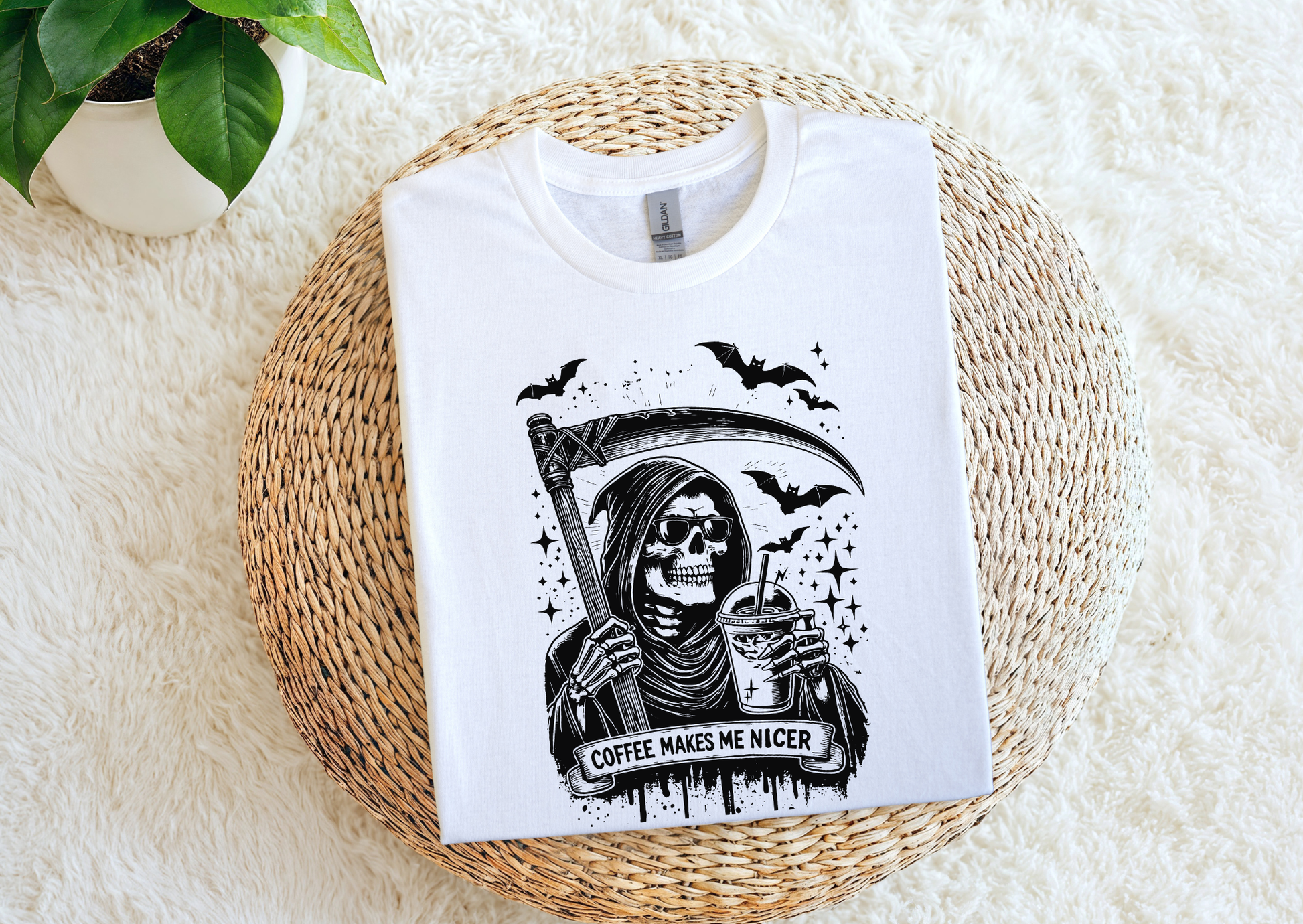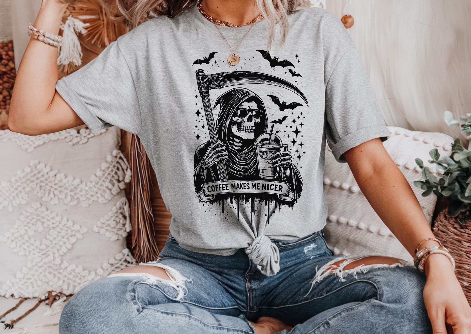 Because caffeine is the only thing standing between you and chaos. This bold design features a reaper with iced coffee in hand... for those who thrive on caffeine, sarcasm, and dark humor.