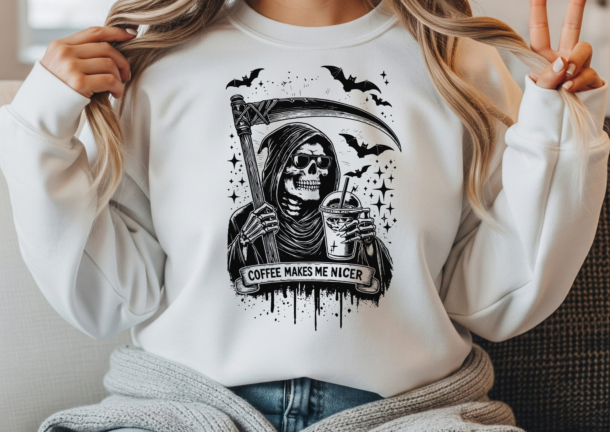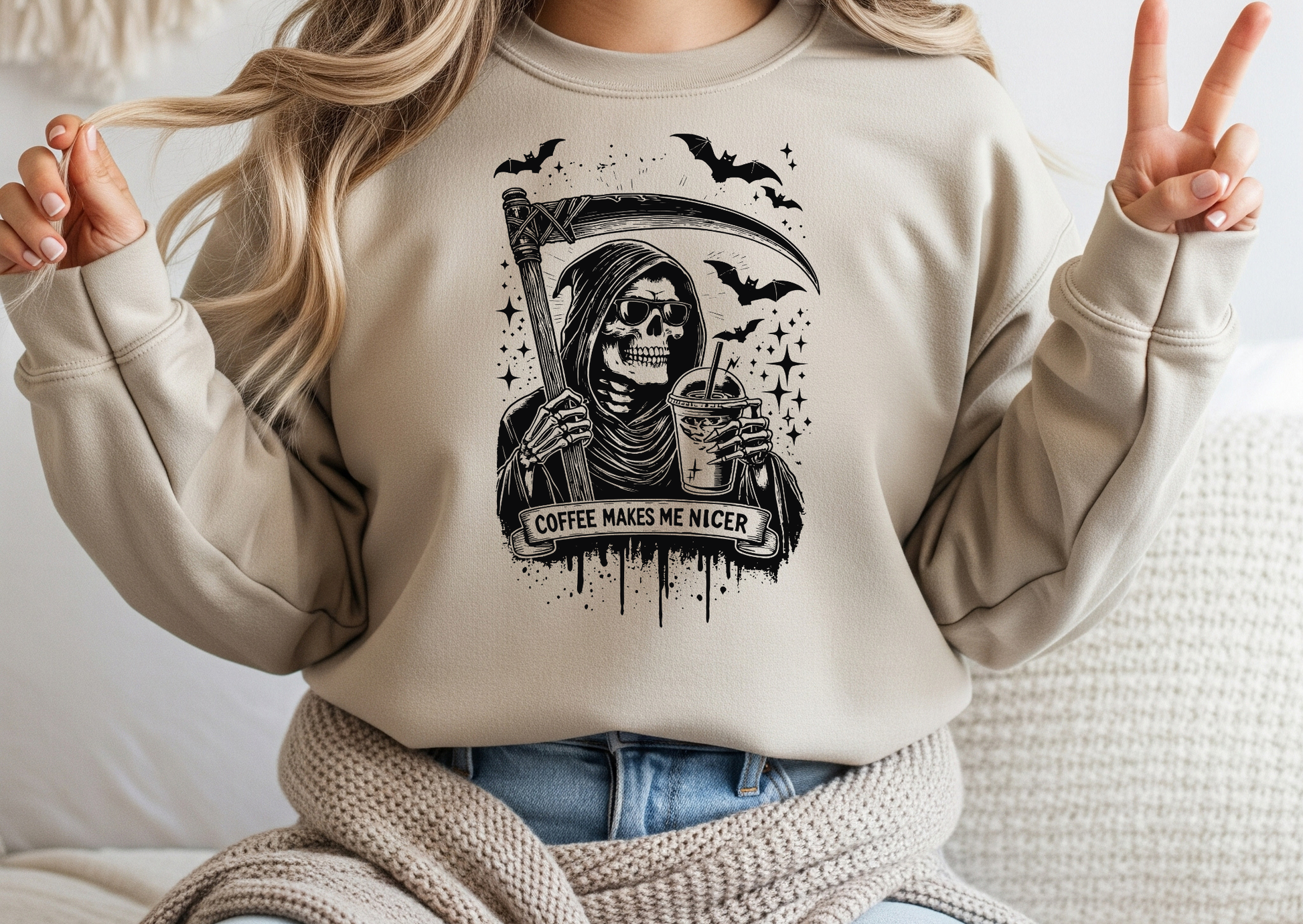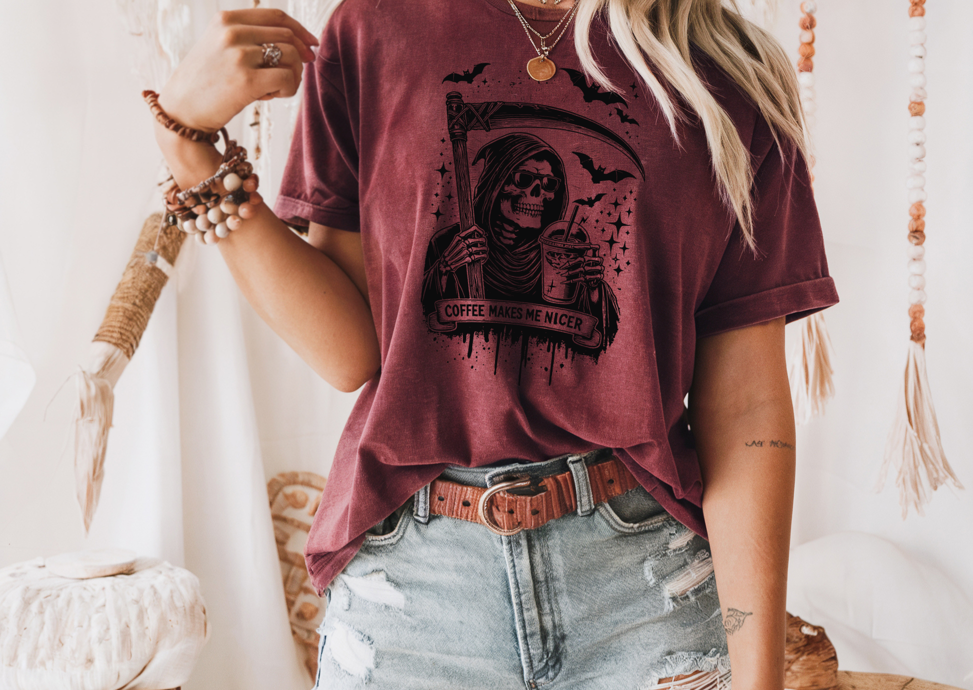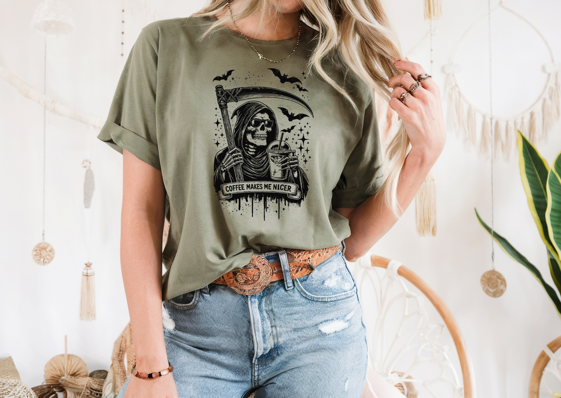 Because caffeine is the only thing standing between you and chaos. This bold design features a reaper with iced coffee in hand... for those who thrive on caffeine, sarcasm, and dark humor.