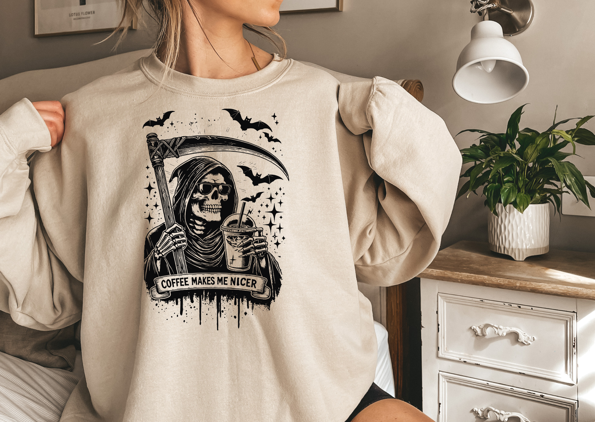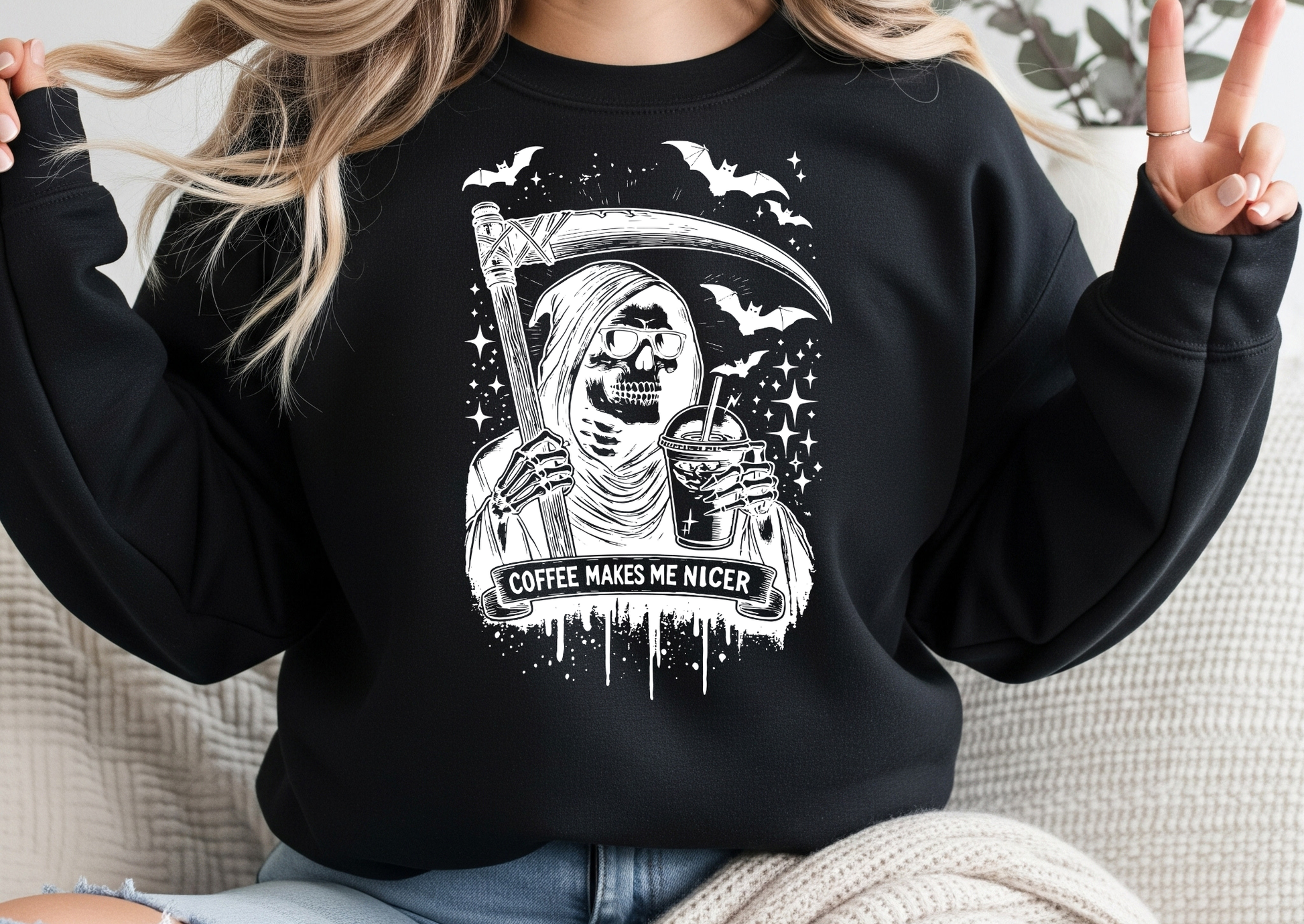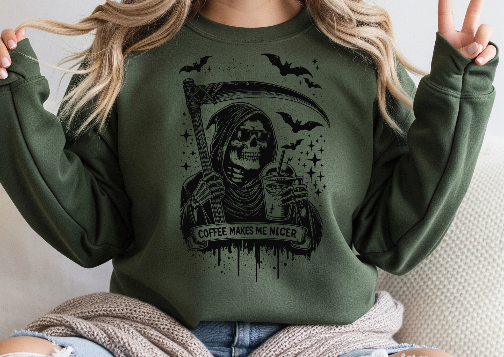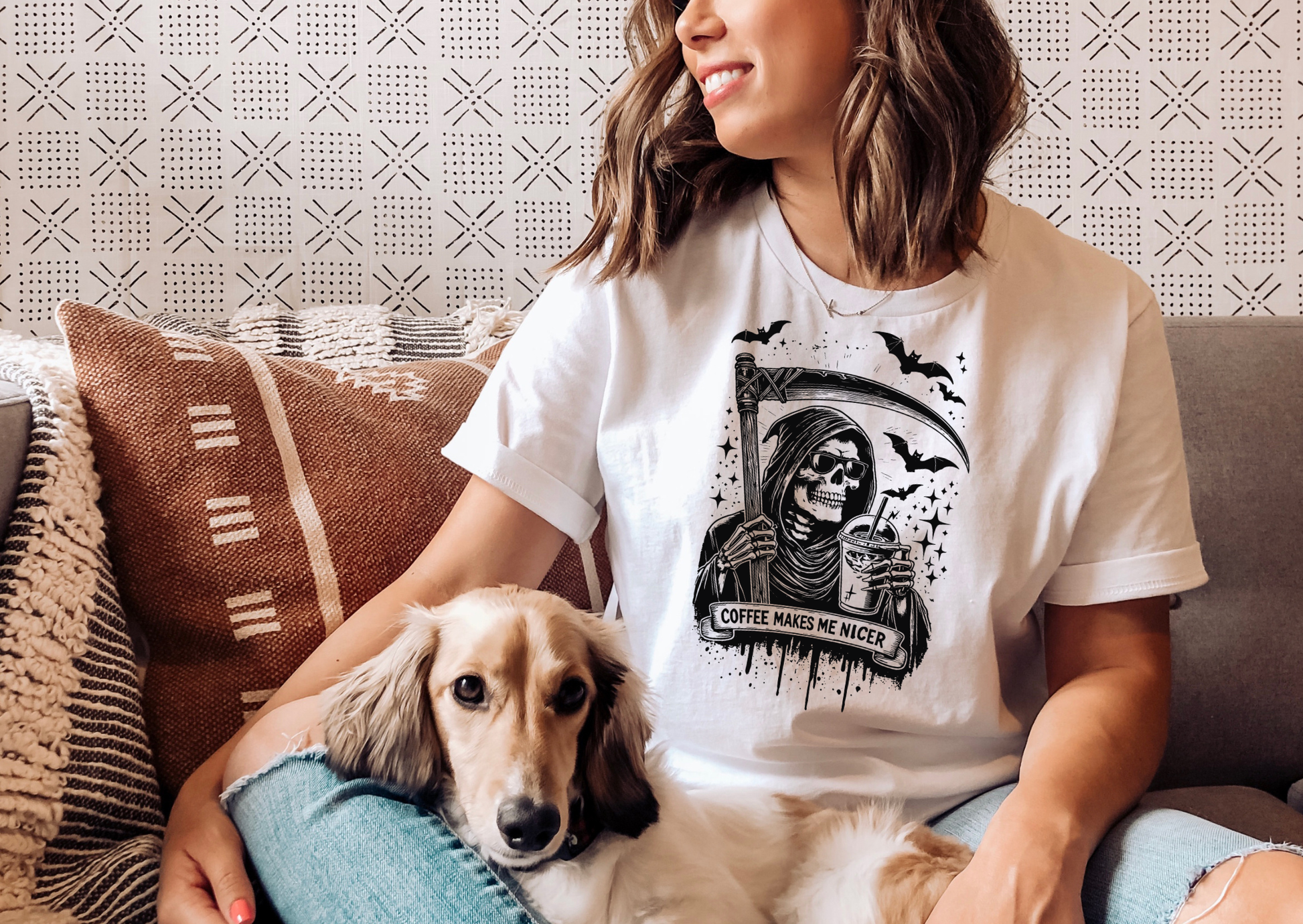 Because caffeine is the only thing standing between you and chaos. This bold design features a reaper with iced coffee in hand... for those who thrive on caffeine, sarcasm, and dark humor.