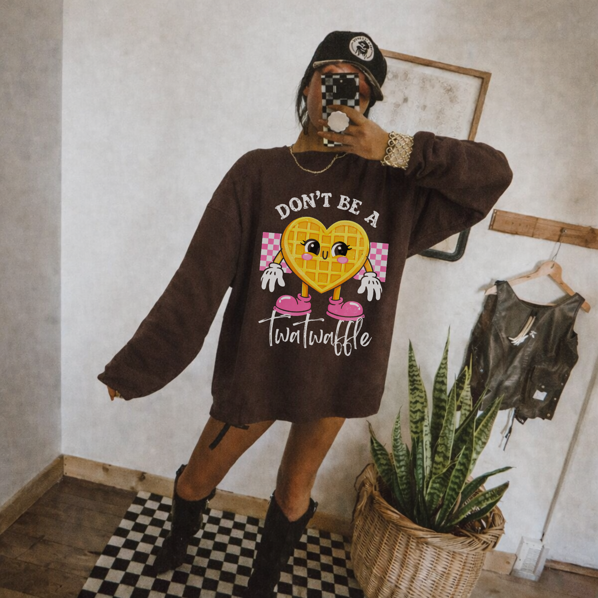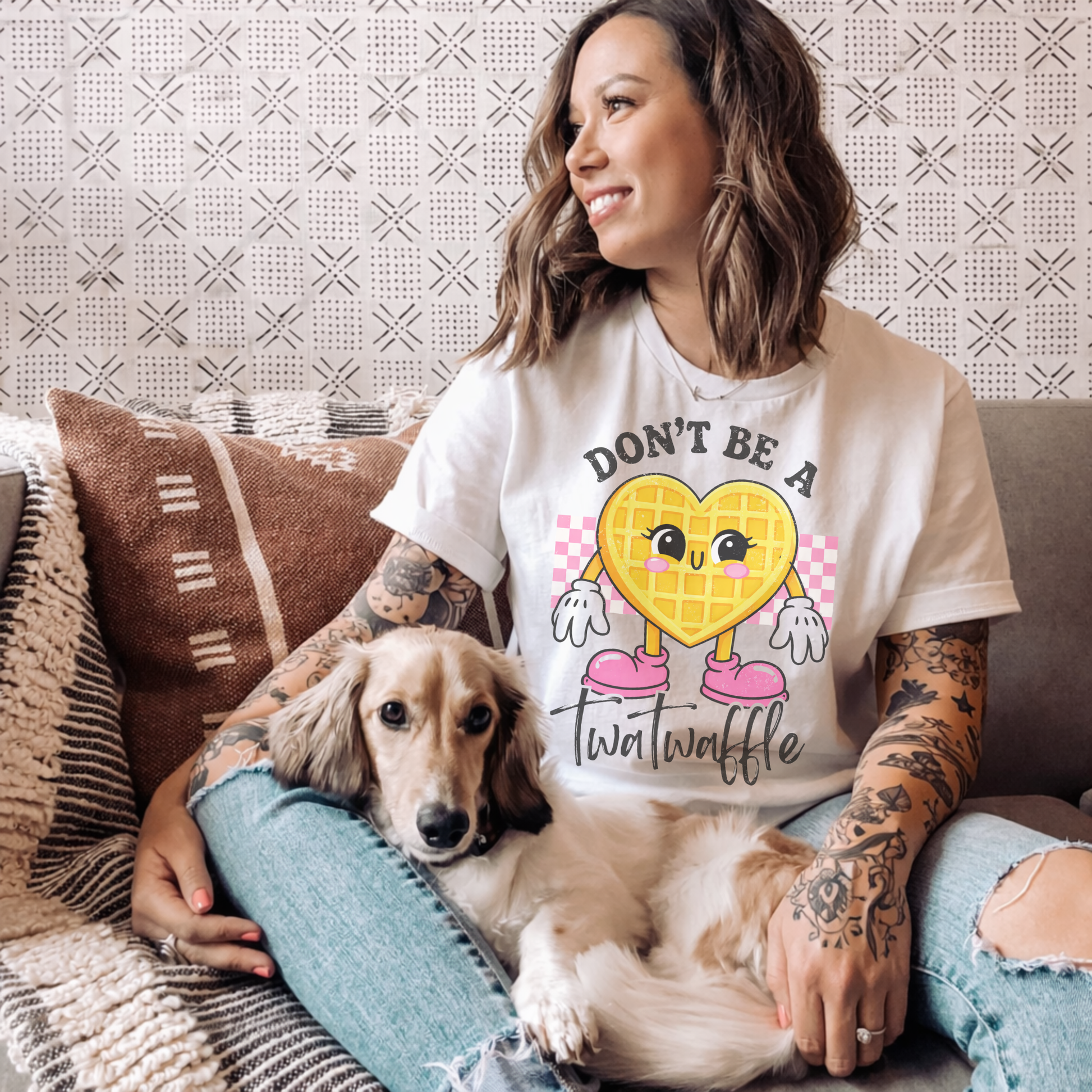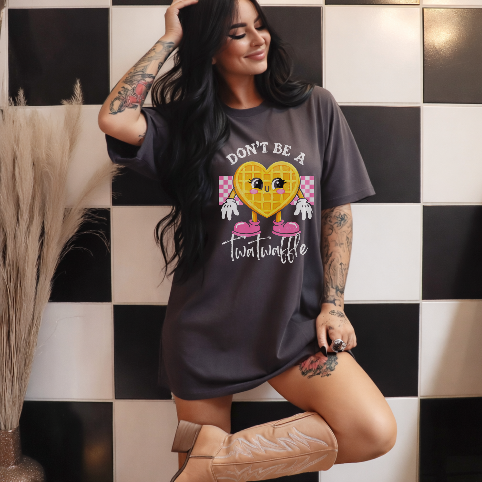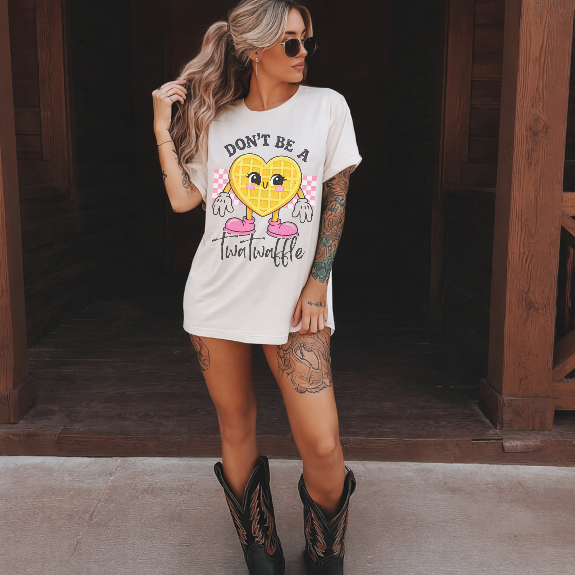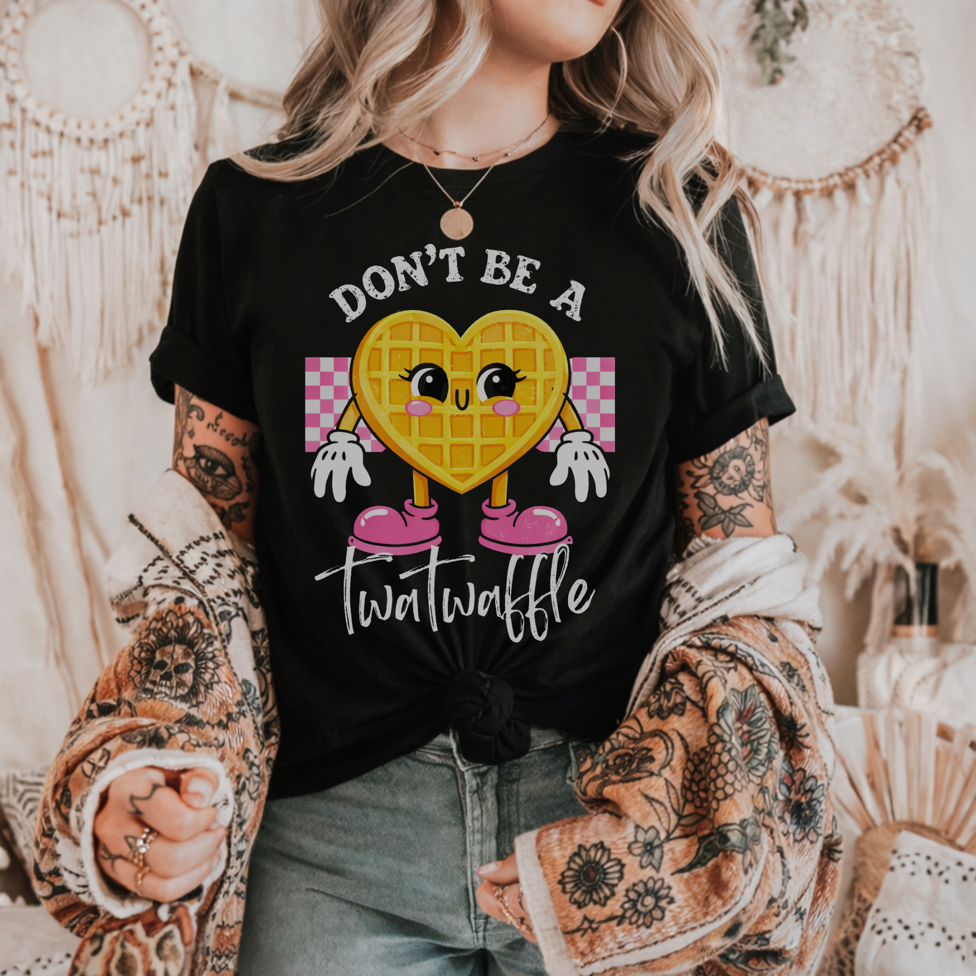 Our “Don’t Be A Twatwaffle” design serves sugary vibes with a side of savage honesty. Featuring an adorable heart waffle graphic with retro charm, this one says what you are thinking… but make it cute.