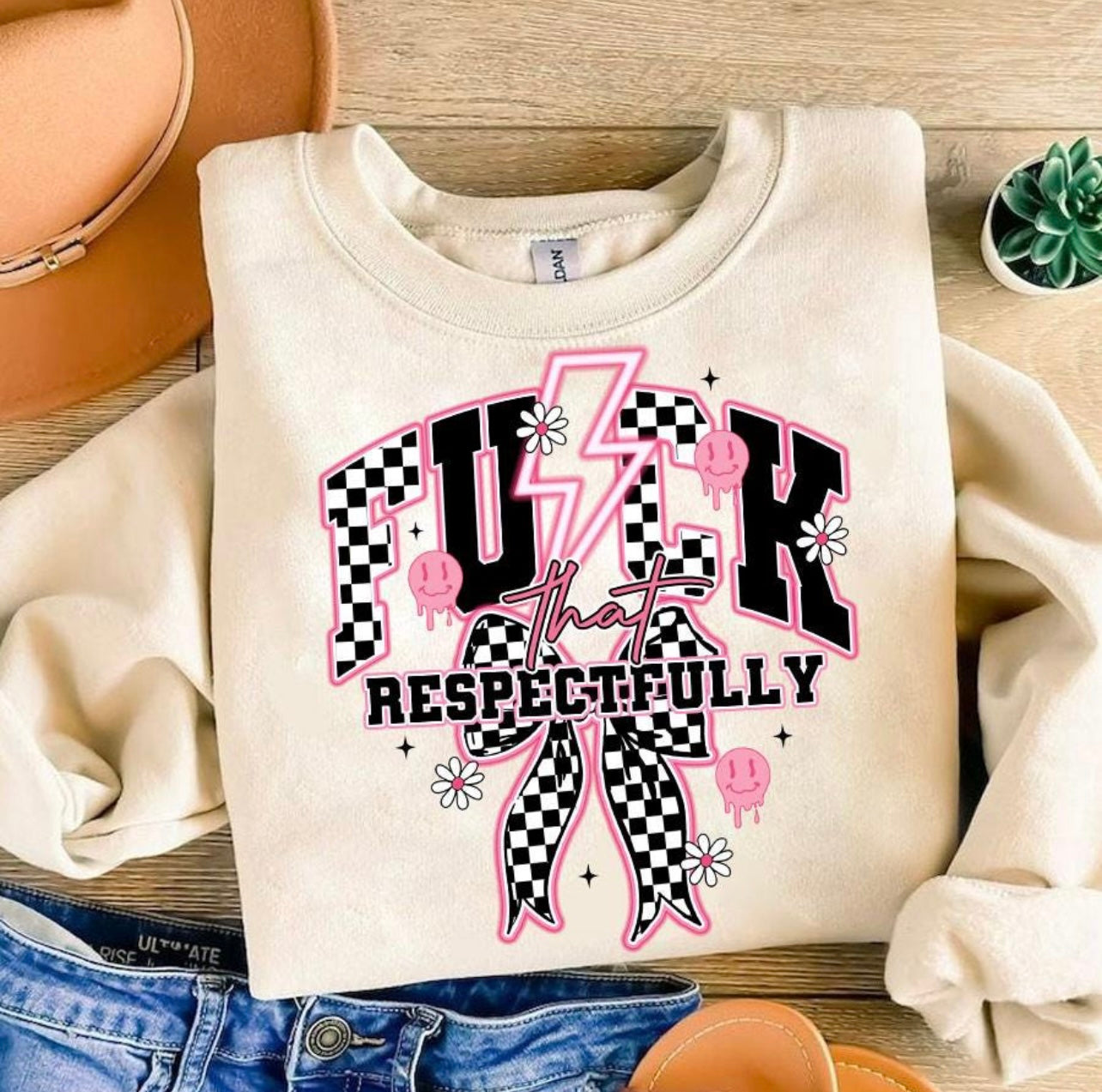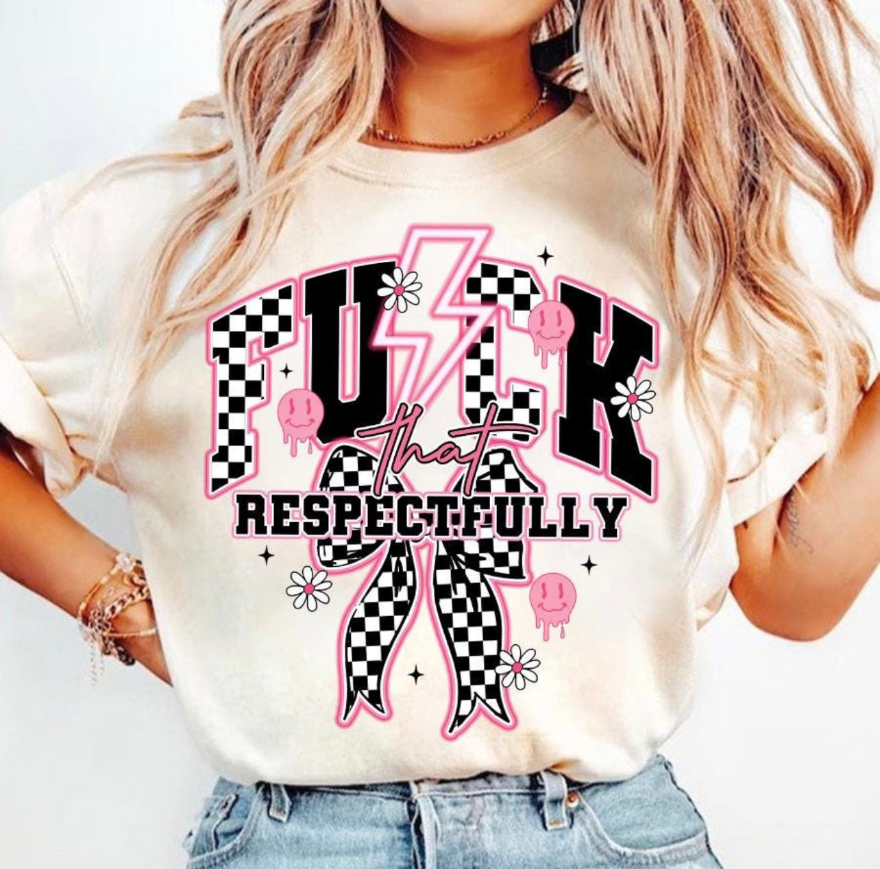Say it louder… with style. Our “Fck That Respectfully” design is for the ones who set boundaries, speak their truth, and look good doing it. With bold checkered details, pops of pink, daisies, and a retro lightning bolt, this design is equal parts sassy and unapologetic.