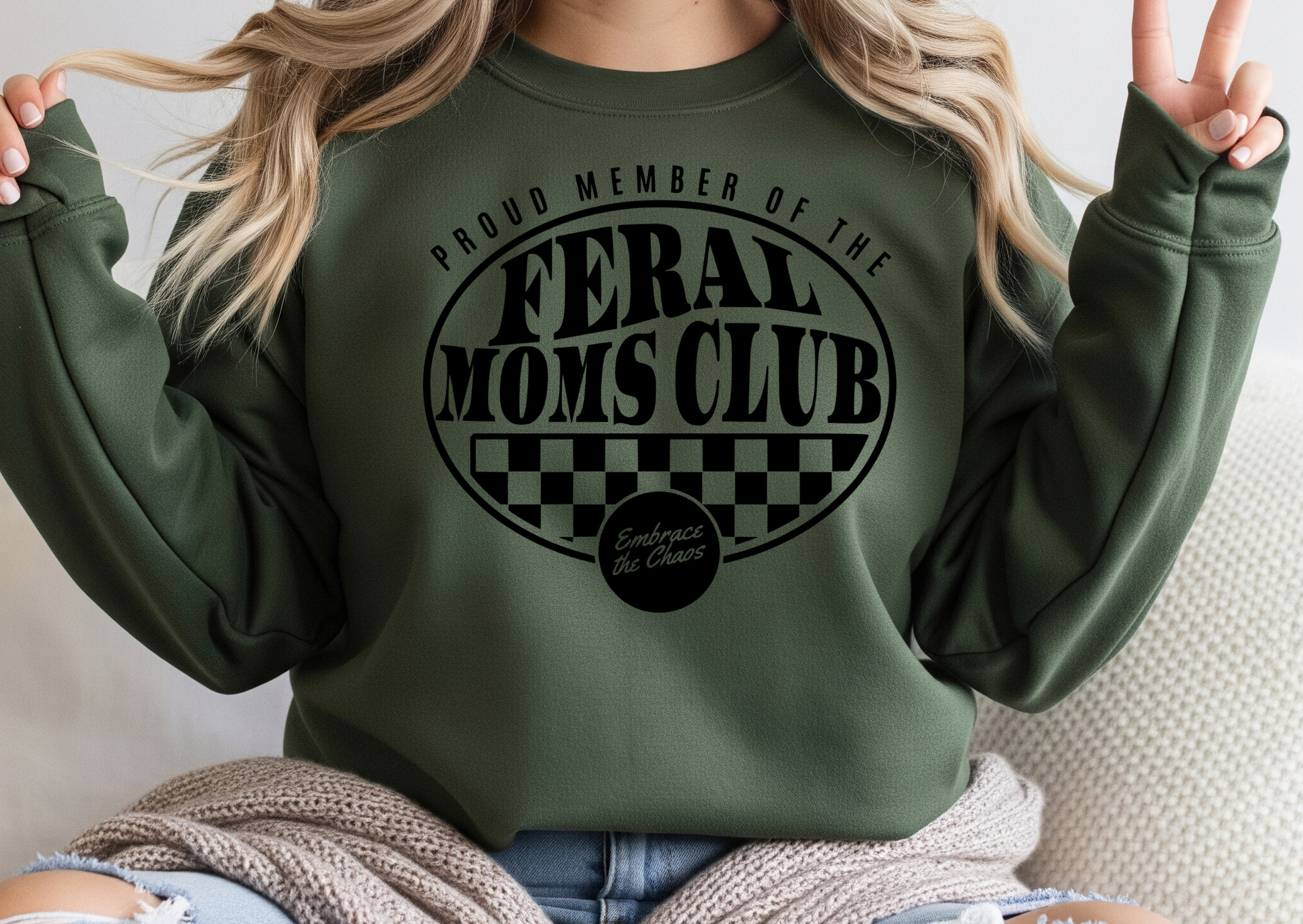 Our Feral Moms Club tee or sweater is the perfect badge of honor for the wild-at-heart, sleep-deprived, coffee-fueled mamas who keep it real. Featuring a bold retro design with checkered accents and “Embrace the Chaos” detail, this piece is all about surviving motherhood with humor and grit.