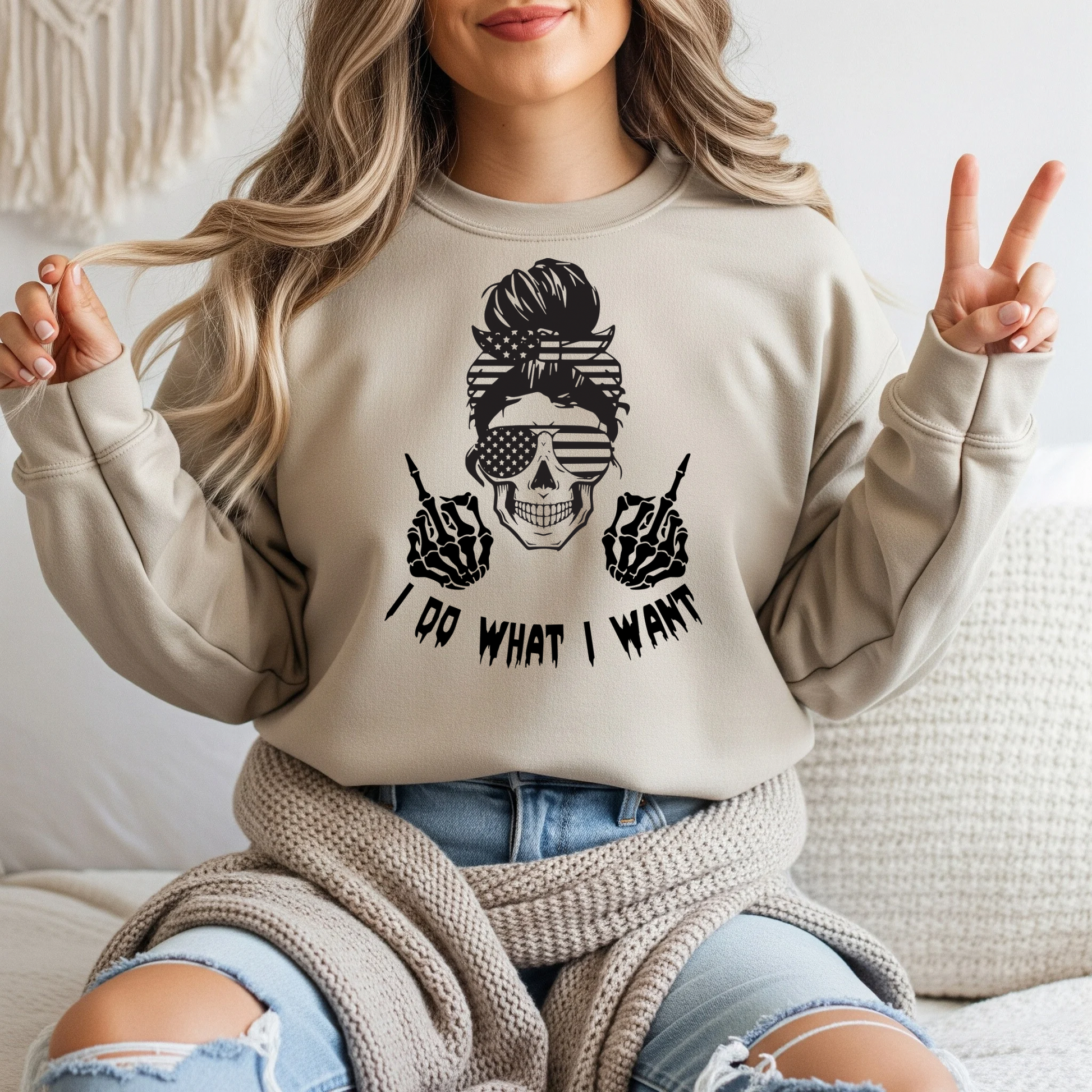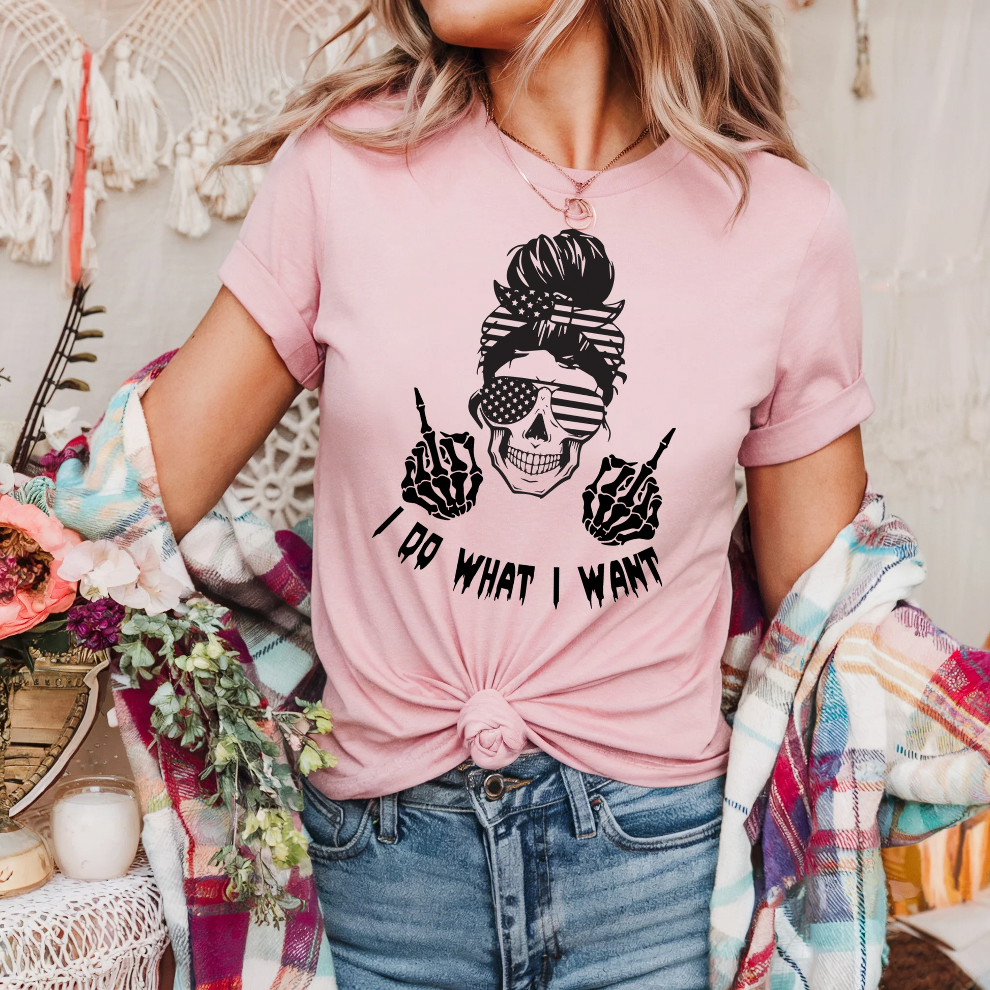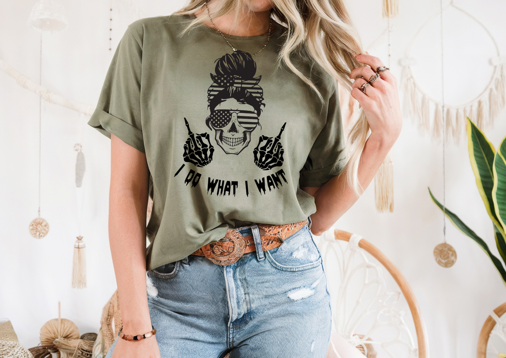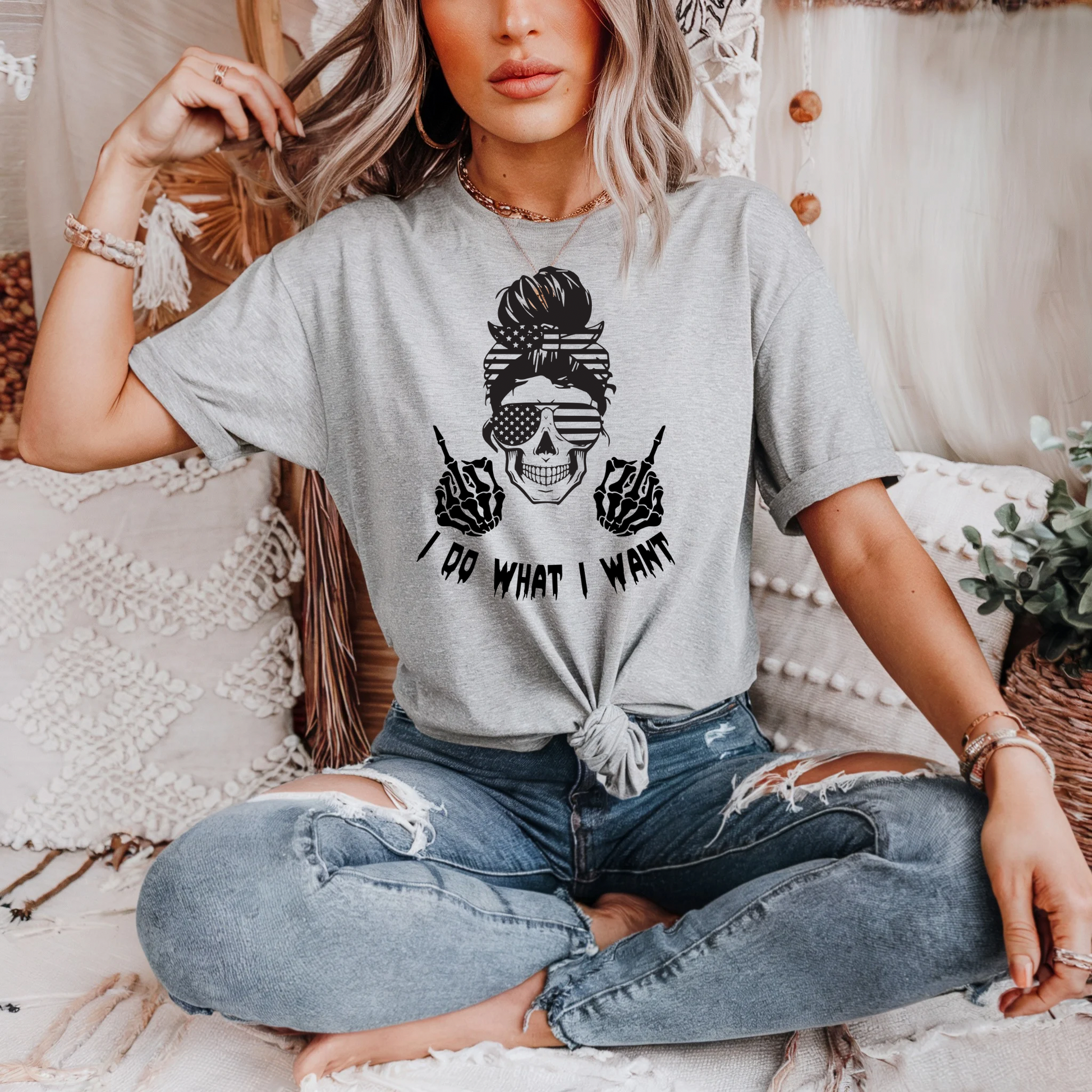 Unapologetic. Bold. 100% you. The I Do What I Want design features a fierce skull bun graphic, American flag shades, and a double dose of attitude. This piece is for the ones who don’t ask for permission… they make their own rules.