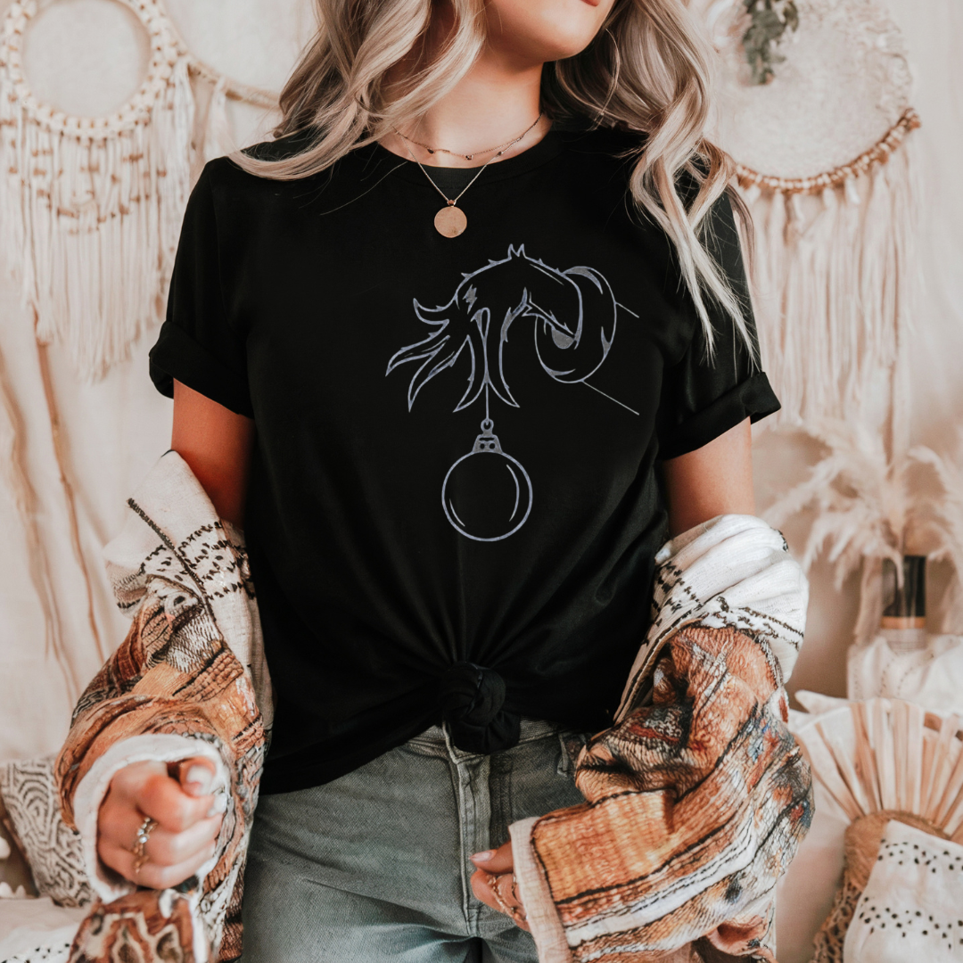 Available in a variety of colors and your choice of T-shirt or sweater, this piece delivers comfort, quality, and a touch of holiday sass.