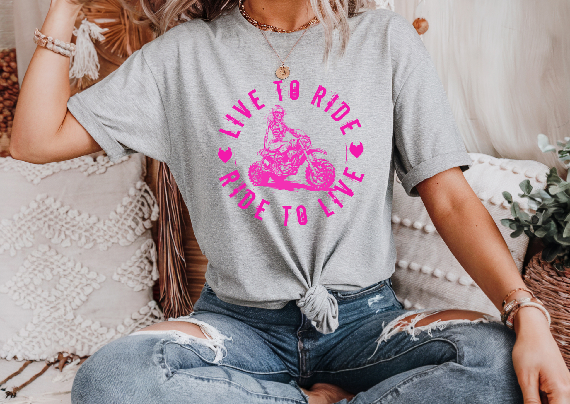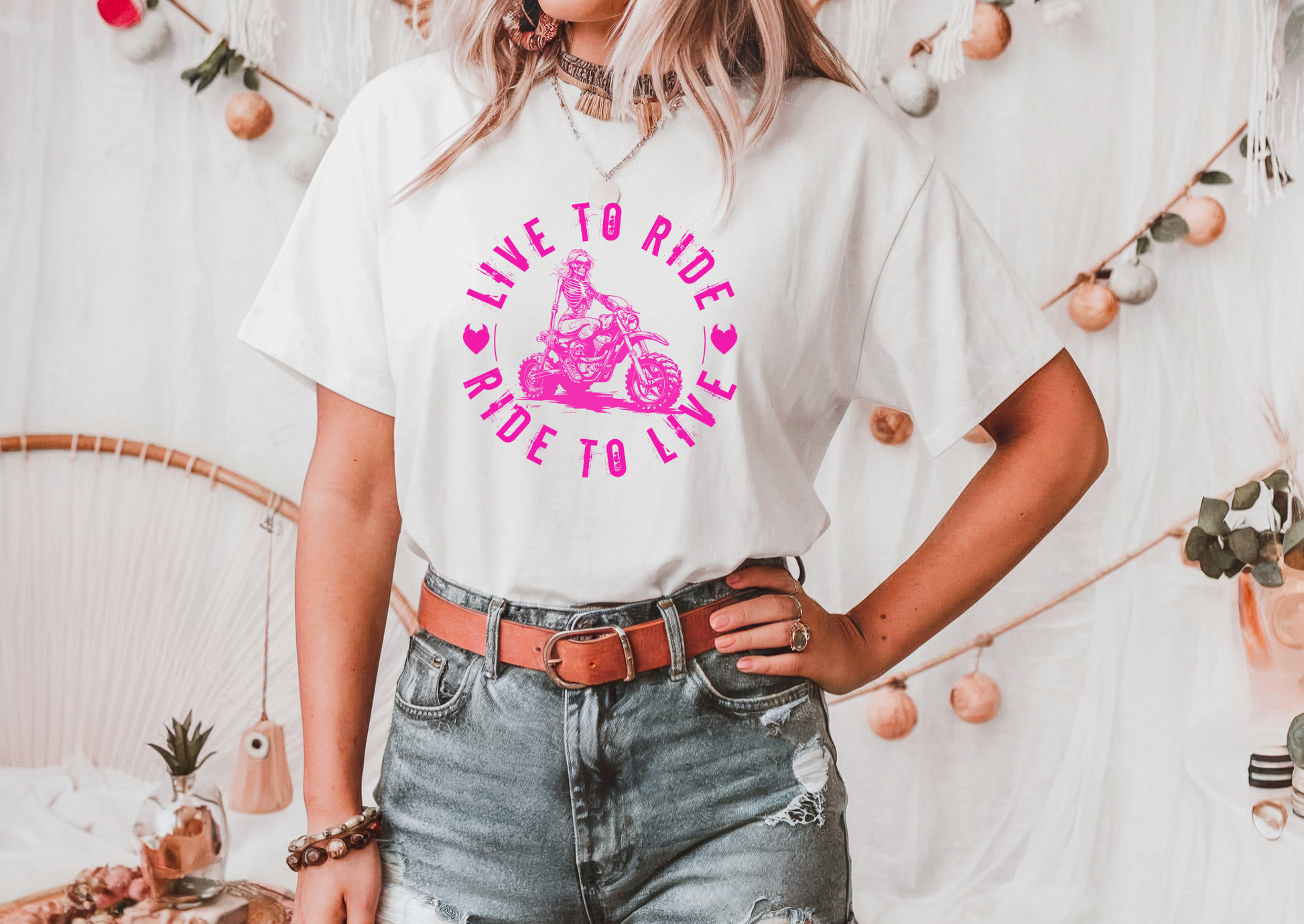 Rev up your style with our “Live to Ride, Ride to Live” design 🏍💀 a bold statement piece for those who live life in the fast lane and refuse to slow down. Featuring a vibrant pink skeleton biker graphic, this design captures that fearless, free-spirit energy every rider knows and loves.