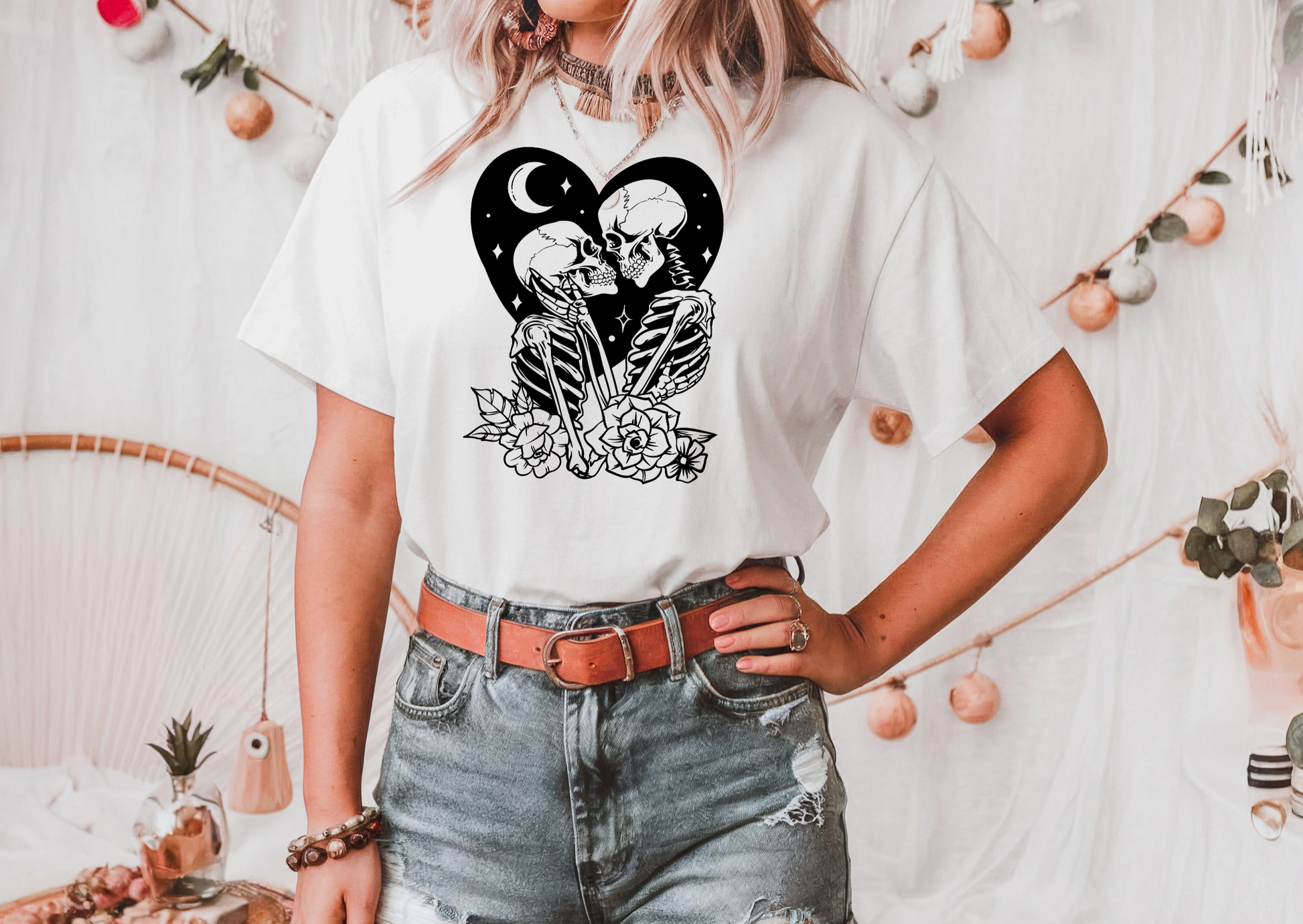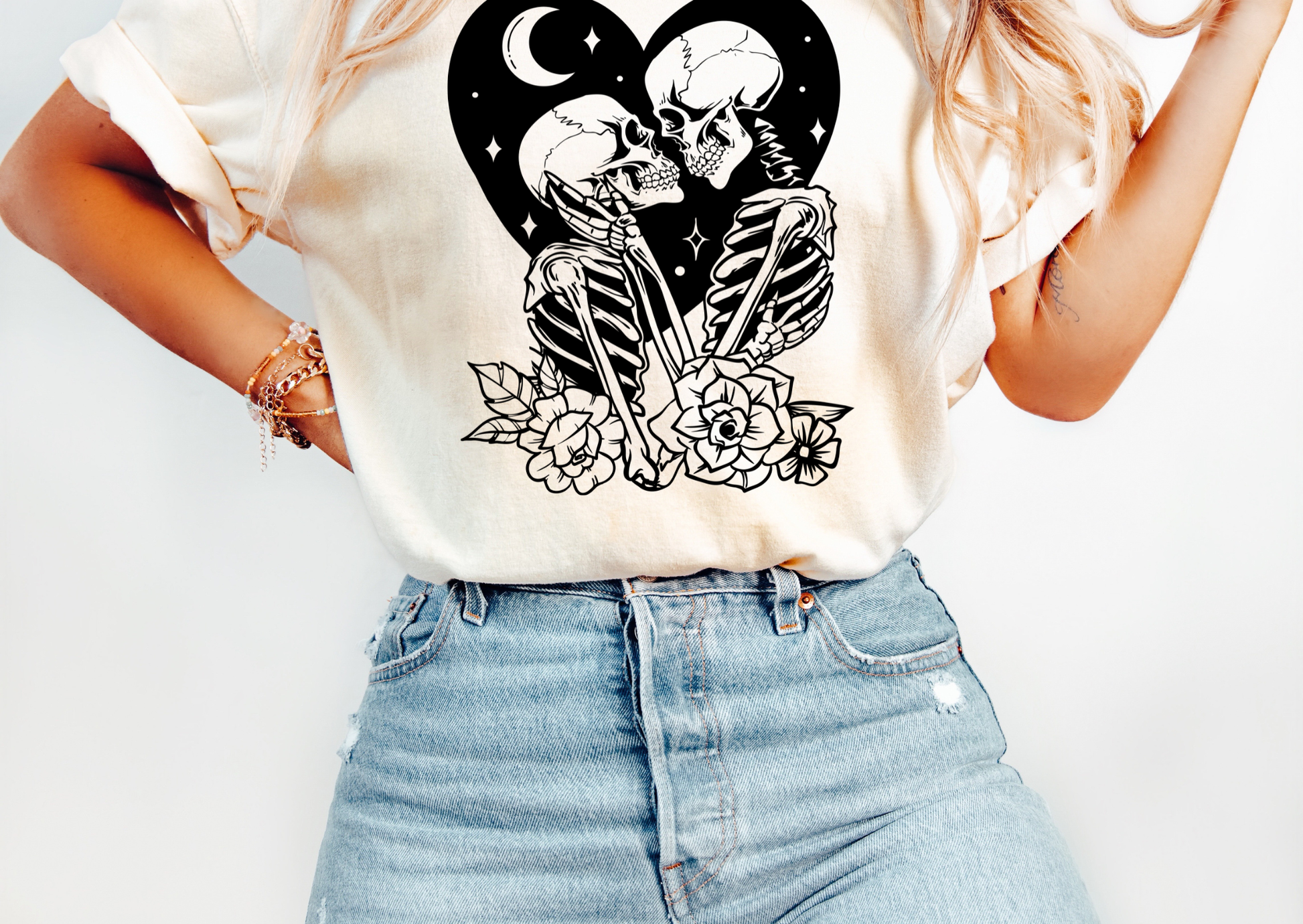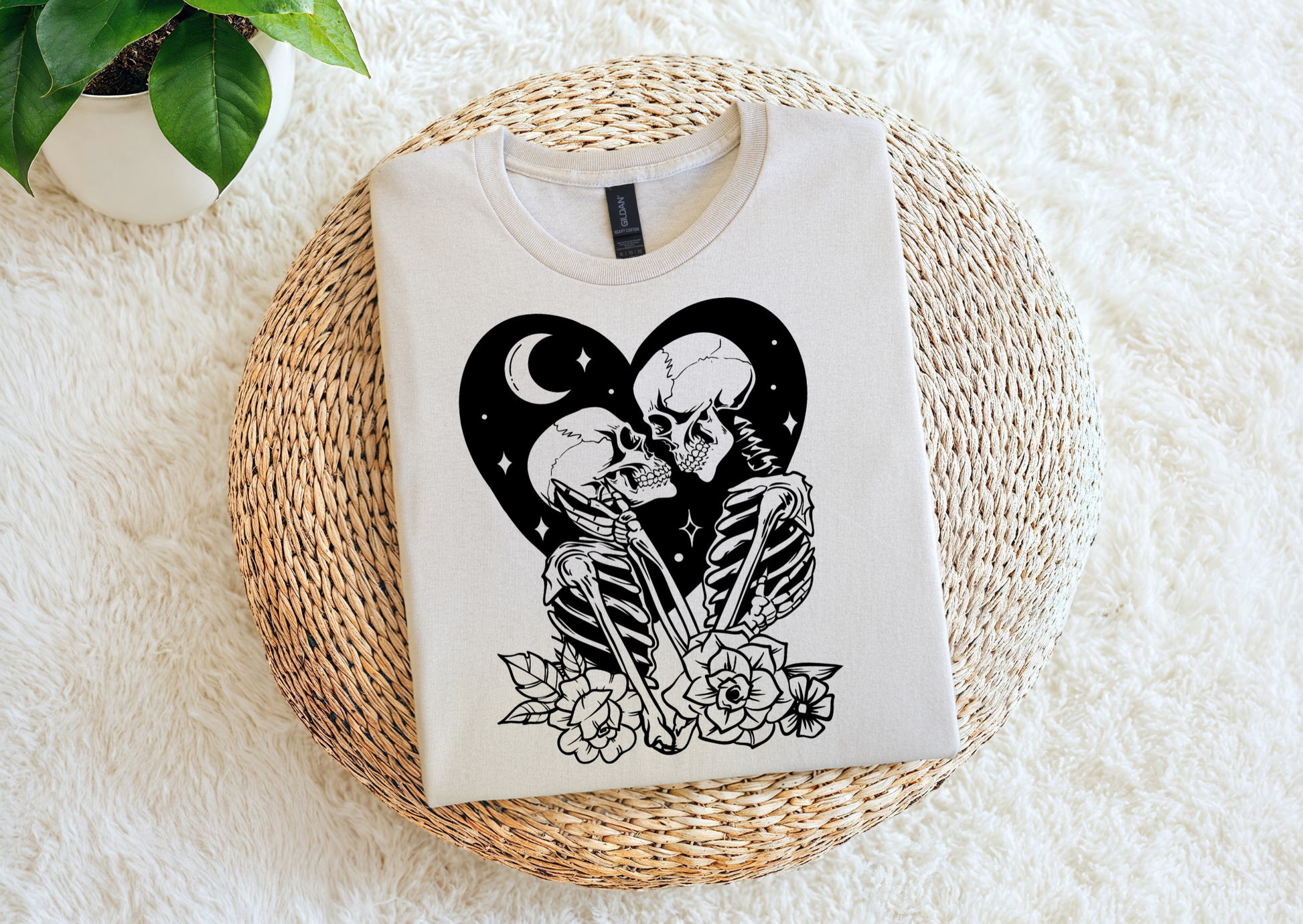 This hauntingly beautiful design features two skeletons locked in an eternal embrace beneath a moonlit sky... a bold symbol of timeless love, loyalty, and edge. Perfect for those who live for dark romance, gothic vibes, or Halloween spirit all year long.