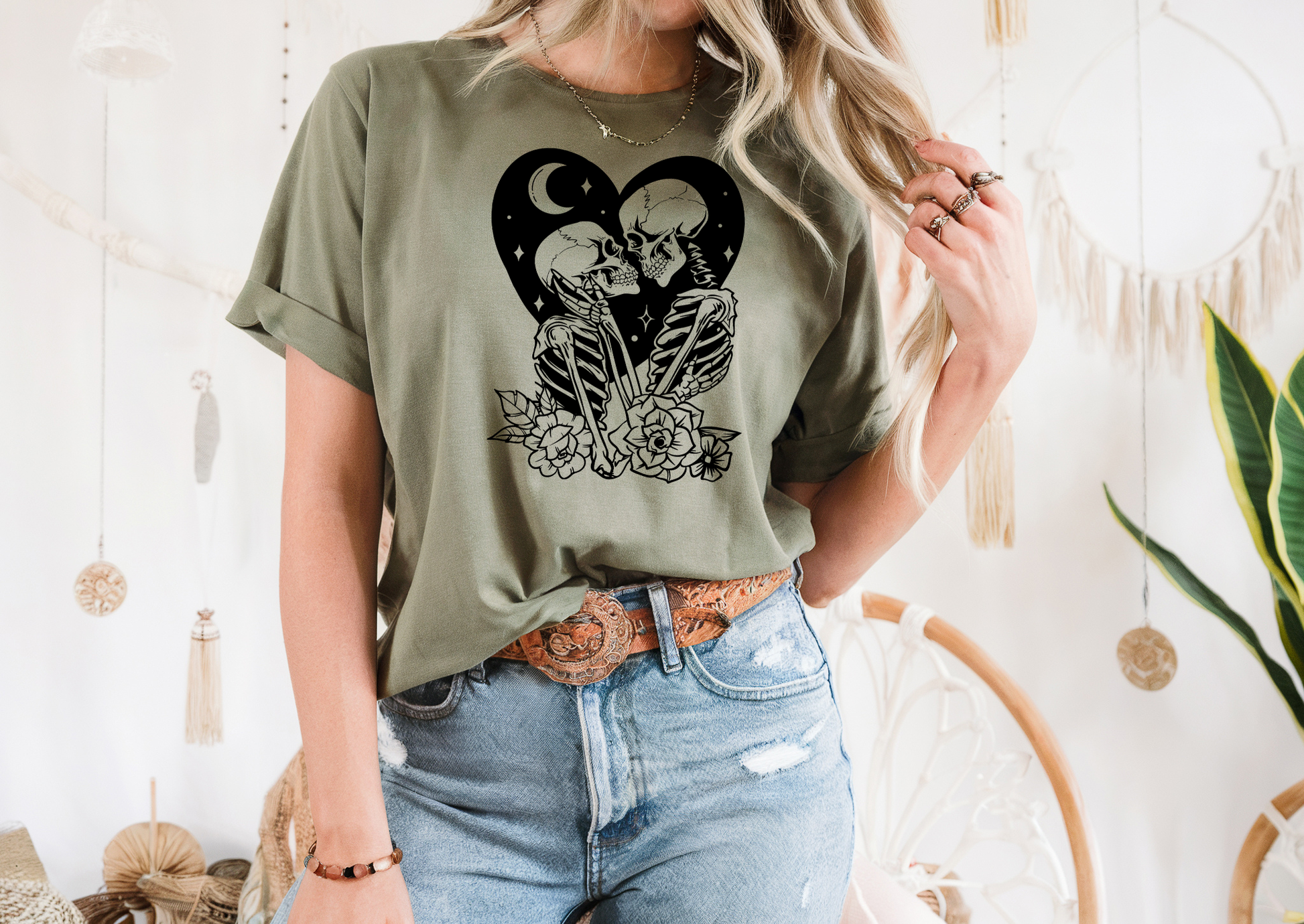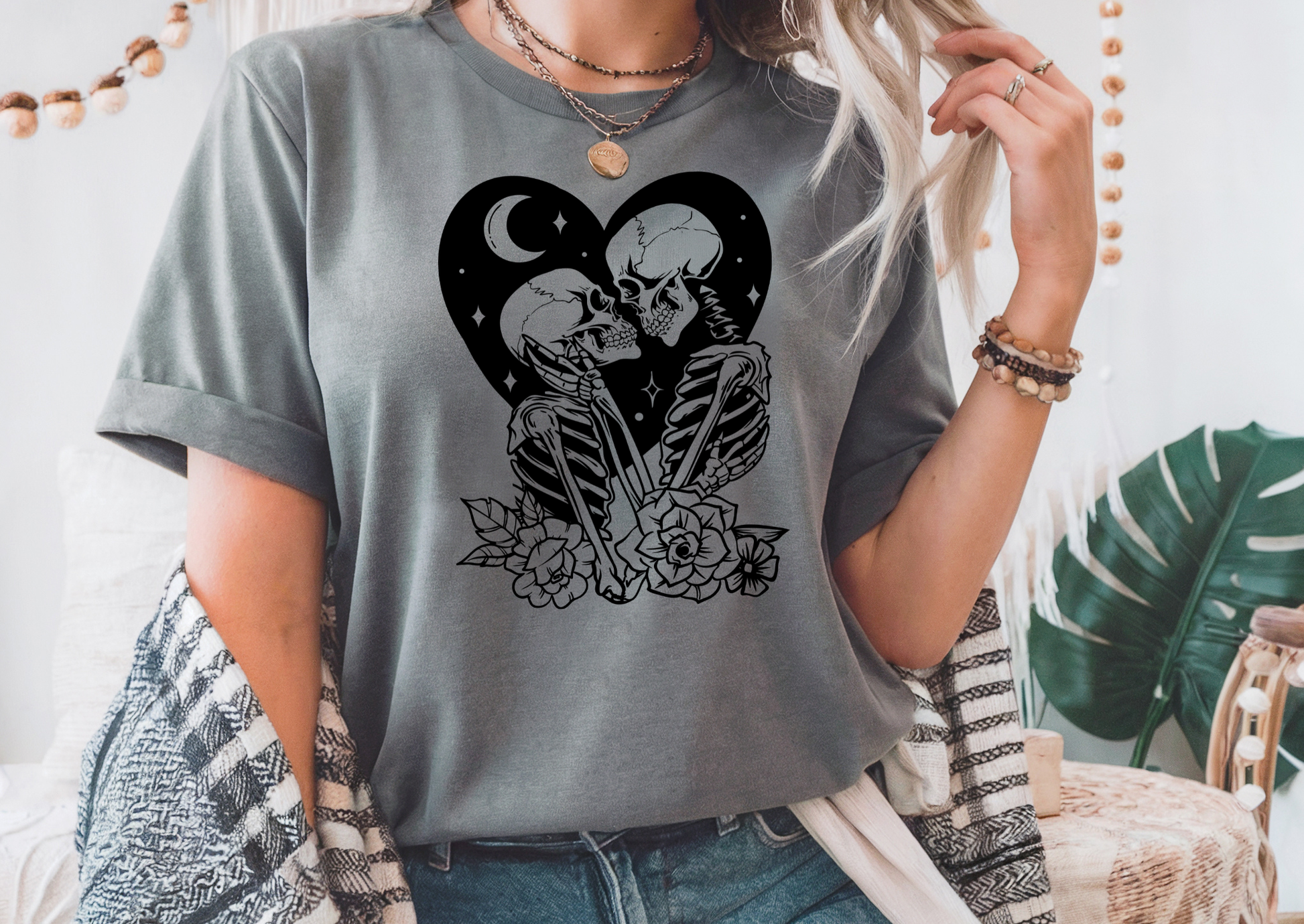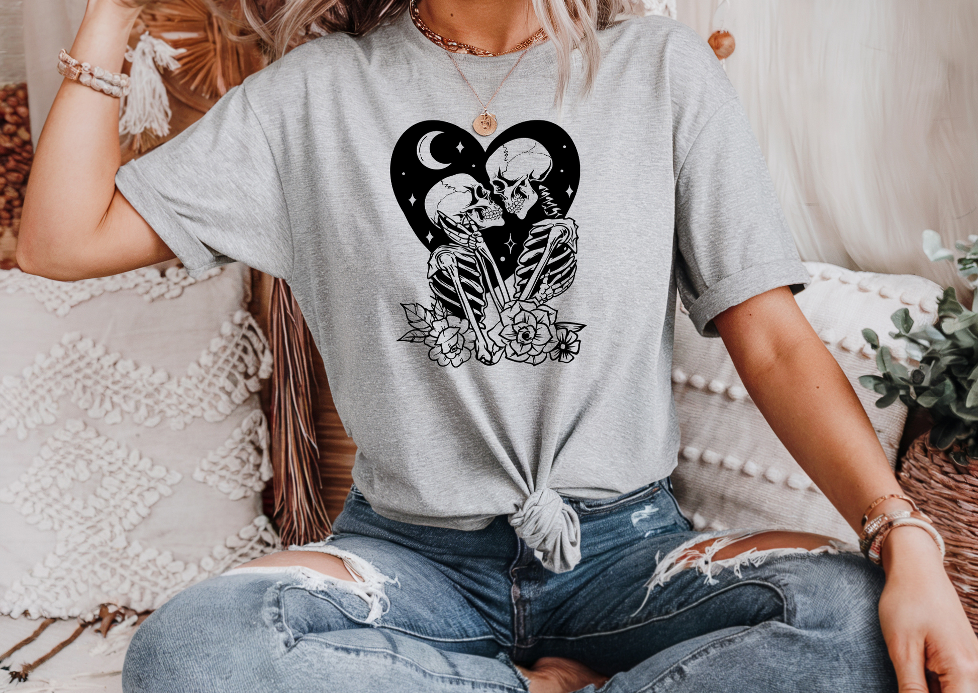 This hauntingly beautiful design features two skeletons locked in an eternal embrace beneath a moonlit sky... a bold symbol of timeless love, loyalty, and edge. Perfect for those who live for dark romance, gothic vibes, or Halloween spirit all year long.
