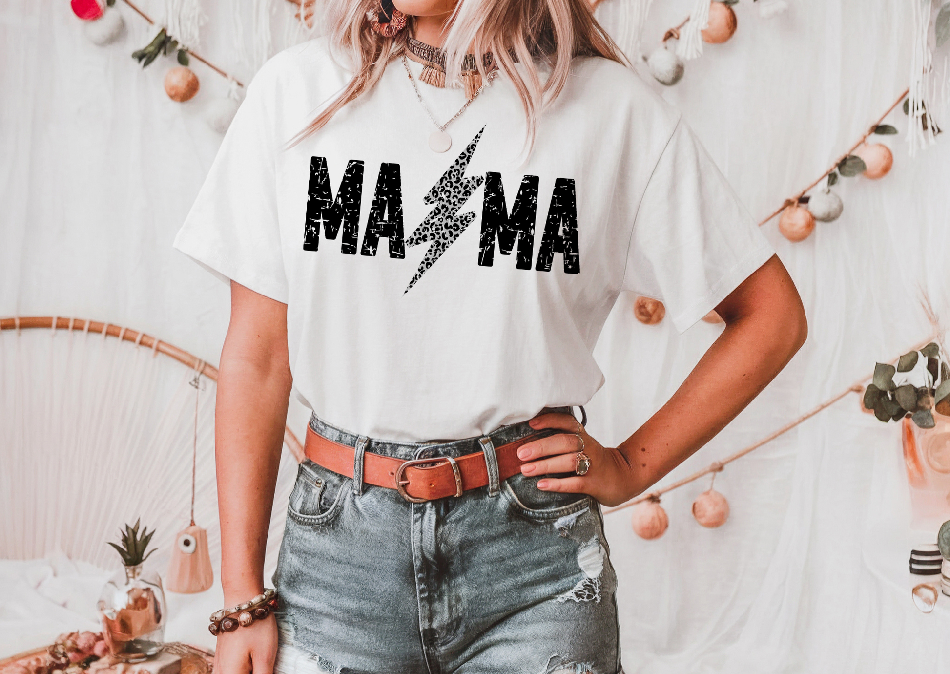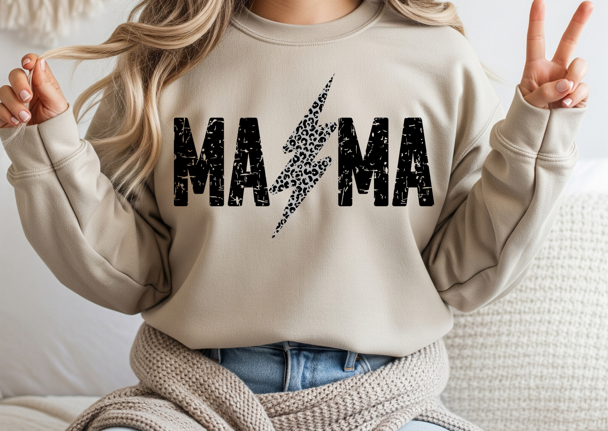 Our MAMA Lightning Bolt tee and sweater are made for the bold, strong, and unstoppable moms who light up every room they walk into. Featuring a distressed design with a fierce leopard-print lightning bolt, this piece is all about confidence, love, and a little edge.