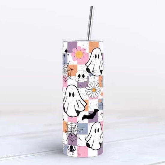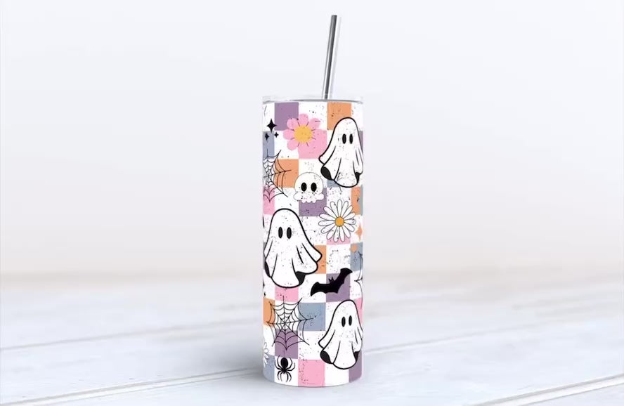 Add a playful touch of Halloween to your everyday drinks! Our Spooky Cute Ghost Tumbler features an adorable patchwork design with ghosts, spiders, bats, flowers, and webs – the perfect balance of creepy and cute.