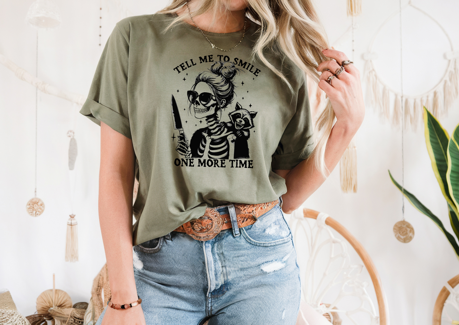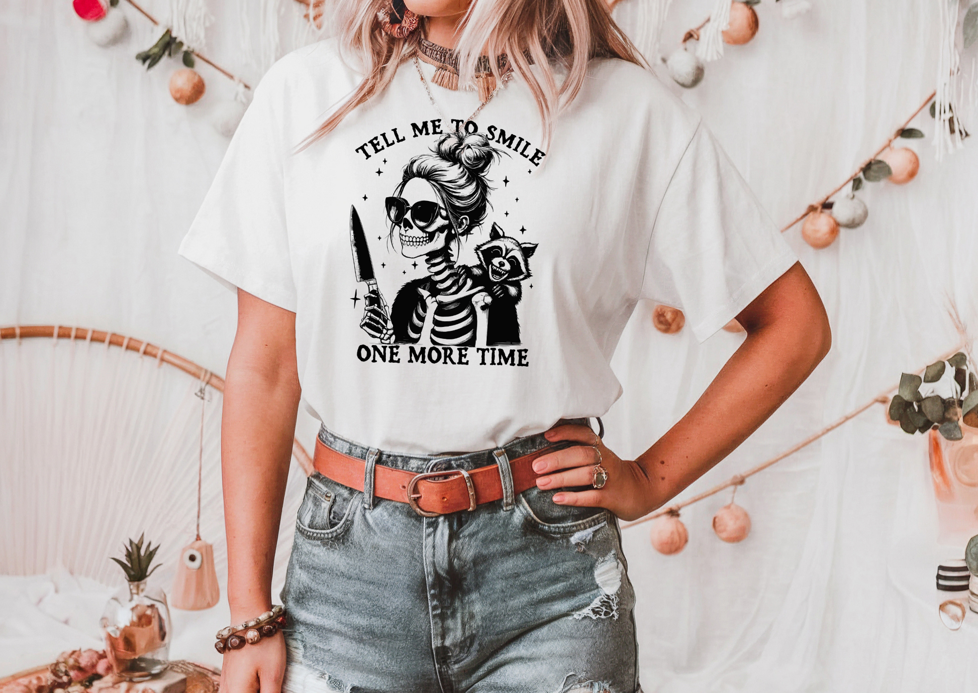 Add some dark humor and attitude to your wardrobe with our “Tell Me to Smile One More Time” design. Featuring a bold skeleton graphic rocking sunglasses, a messy bun, and holding a knife with a mischievous raccoon sidekick—this piece says what you’re really thinking without saying a word.