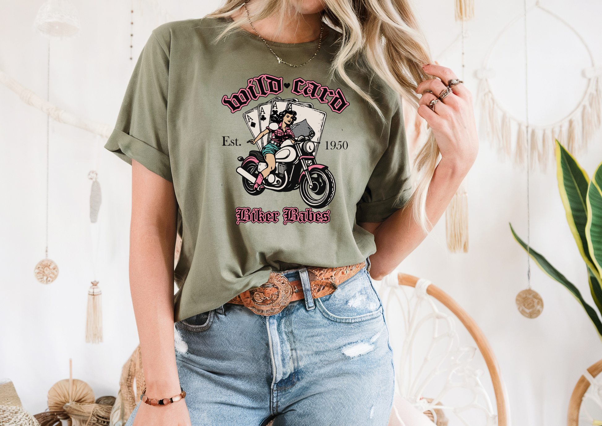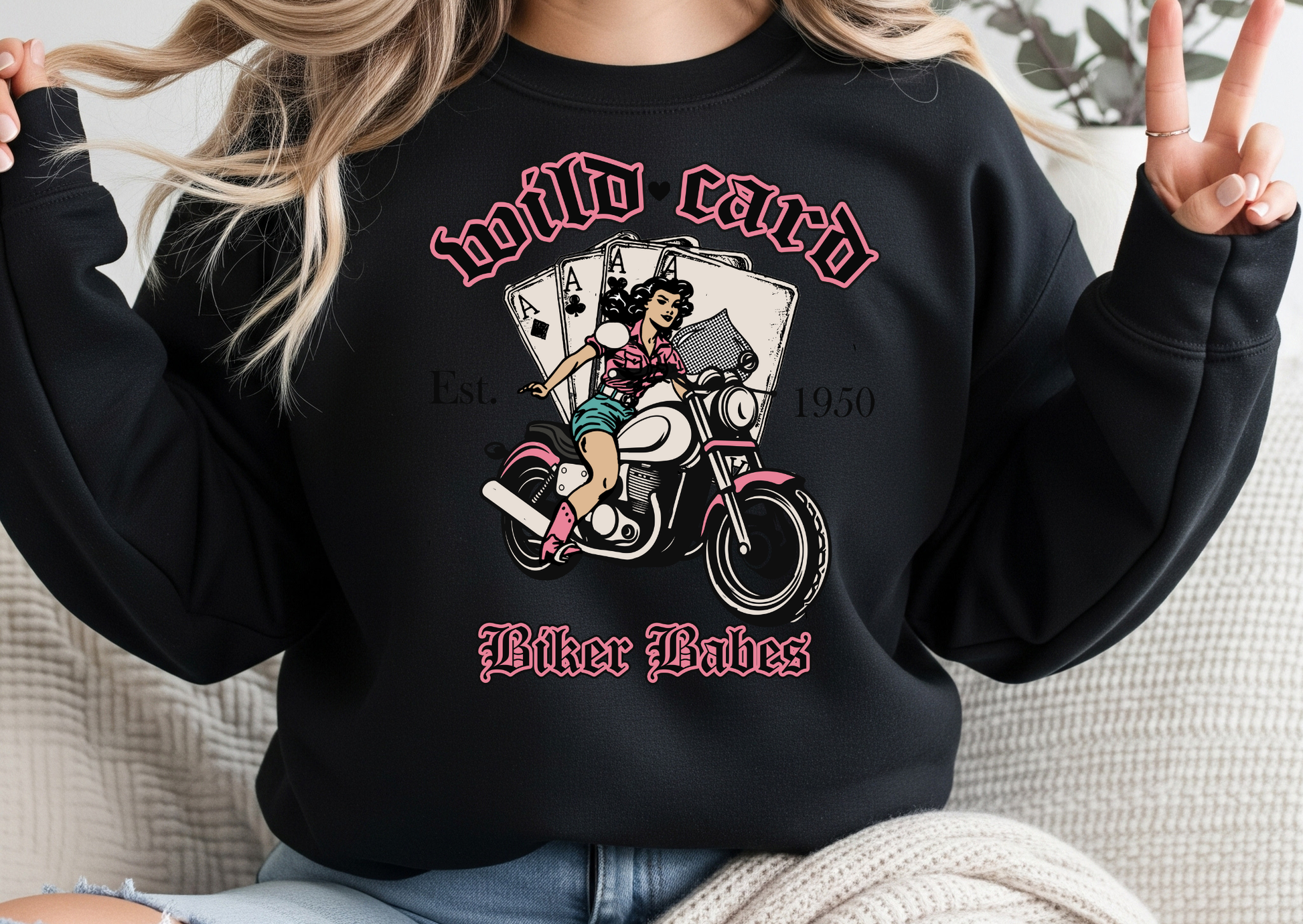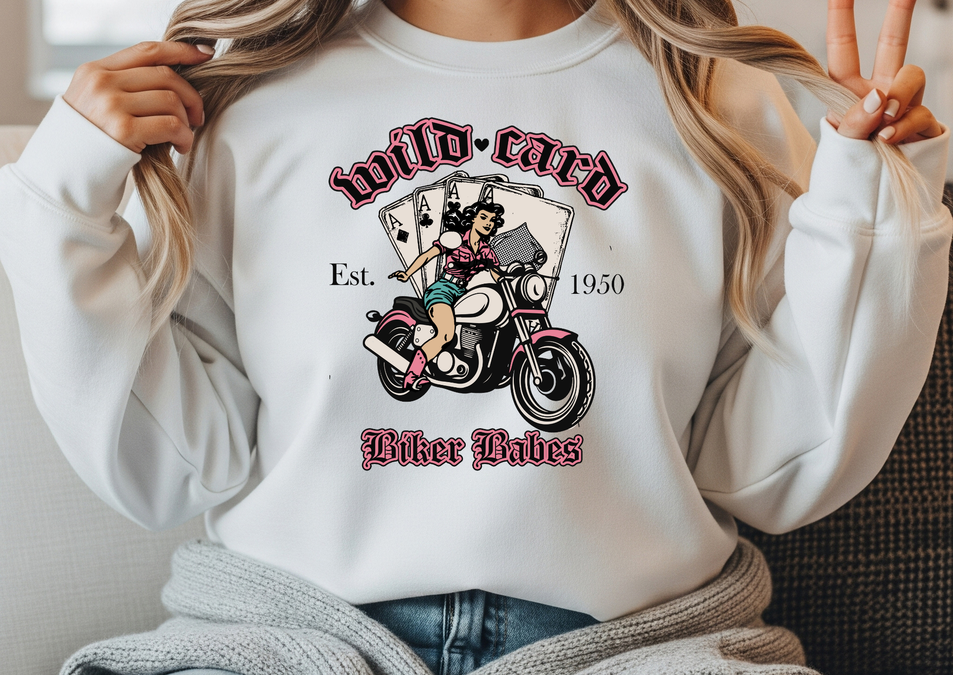 For the bold, the fearless, and the women who play by their own rules, this Wild Card tee or sweater is your new go-to. Featuring a retro pin-up biker design with playing cards, pink accents, and vintage typography, it’s the perfect blend of sass, style, and strength.